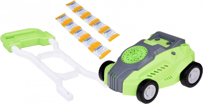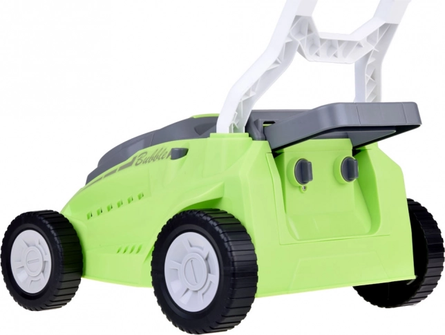 Здравата пластмасова изработка, широката основа за стабилност и приятните детски цветове правят косачката чудесен спътник за игри на открито. Реалистичните звуци насърчават имитирането на възрастните и развитието на моториката. В комплекта е включено всичко необходимо, включително 10 сашета с разтвор и стикери за персонализация.
