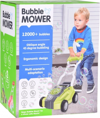 Тази балонена косачка съчетава движение, въображение и сетивни изживявания в една забавна играчка. Достатъчно е да напълните резервоара с разтвор за балончета, да натиснете бутона и при бутане на косачката във въздуха ще заиграят множество цветни балончета.