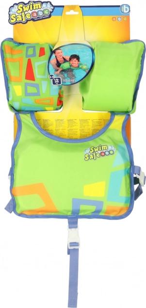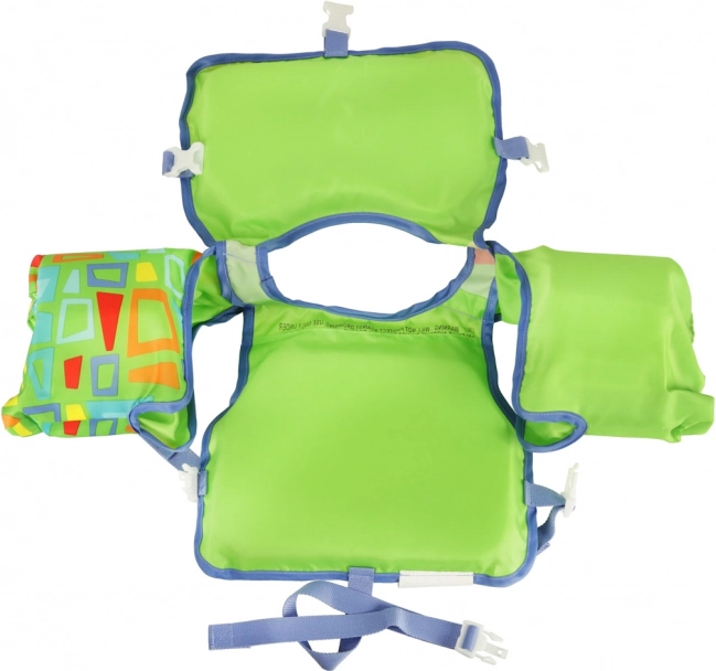 Пяненият пълнеж на жилетката осигурява отлична плавателност, докато пришитите ръкави, обшити с мек материал, задържат детето без усилие на повърхността. Регулируемите катарами гарантират перфектно напасване към тялото на детето, което осигурява комфорт по време на игра. Жилетката се отличава с ярък, зелен дизайн и интересен десен, който привлича вниманието и прави детето видимо дори отдалеч.