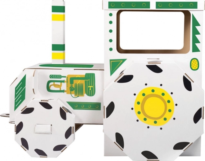 Този детски картонен трактор насърчава фантазията, съвместната игра и развитието на фината моторика. Лекият, но здрав картонен корпус е безопасен за домашна употреба и готов за бързо сглобяване. Неутралната бяла повърхност със зелено-жълти детайли изглежда игриво и лесно се вписва във всяка детска стая.