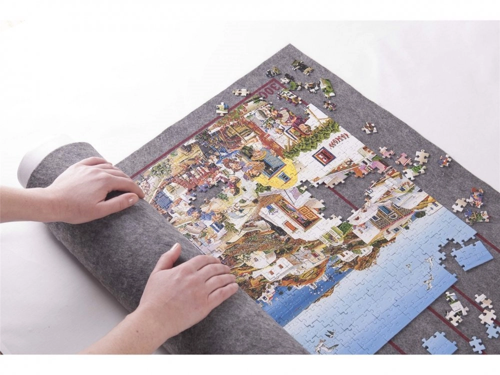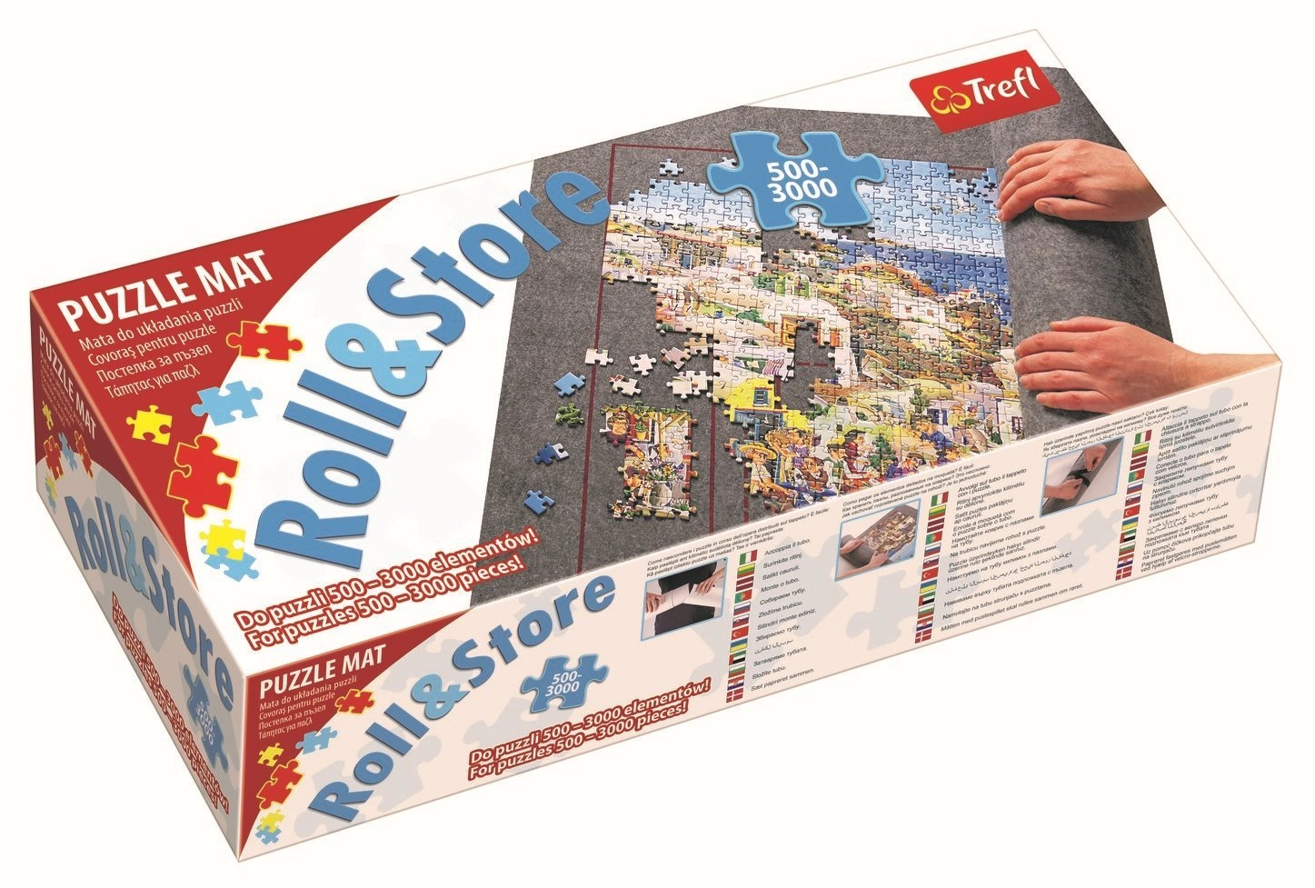 Навиващата се филцова подложка за пъзели TREFL улеснява подреждането и съхранението на започнати картини. Предлага голяма филцова повърхност 124 × 94 cm с водещи рамки за 500–3000 части и благодарение на тубуса и 3-те ленти с велкро пъзелът безопасно се навива, пренася и съхранява без изгубени елементи.