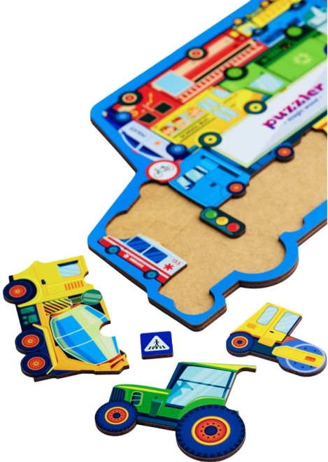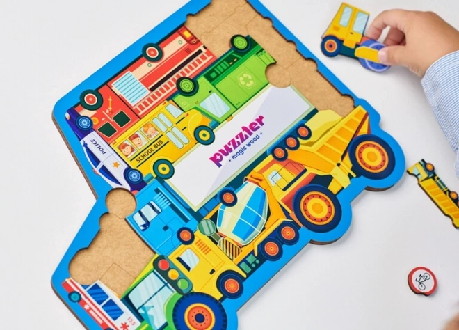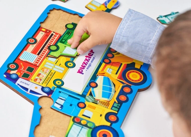 Дървеният пъзел на тема транспорт носи на децата учене под формата на игра. Всяка от 18-те части представя отделно превозно средство или пътен знак, благодарение на което децата упражняват разпознаване на форми, речников запас и търпение. Здравото дървено изпълнение гарантира дълъг живот и безопасно боравене за малките ръчички.