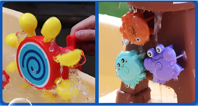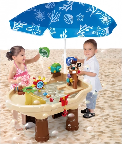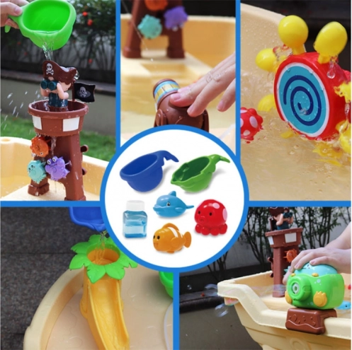 Тази пиратска водна масичка е идеален център за игри на открито. Децата могат да правят водни експерименти, да създават цветни балончета, да стрелят с водното оръдие и да наблюдават как водата задвижва зъбните колела и милите животинки. Масичката насърчава креативността, любопитството и координацията око–ръка.