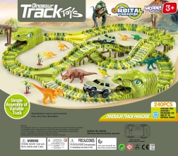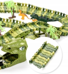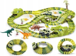 Постройте за децата свят на праисторически приключения. Комплектът съдържа всичко за дълга и креативна игра: модулна зелена писта, 8 динозавъра (включително 2 големи), 2 тунела във форма на динозавърска глава, мостове, дръвчета и електрическа количка с батерия AA. Частите се щракват лесно една в друга и оформят кръг, по който количката се движи сама.