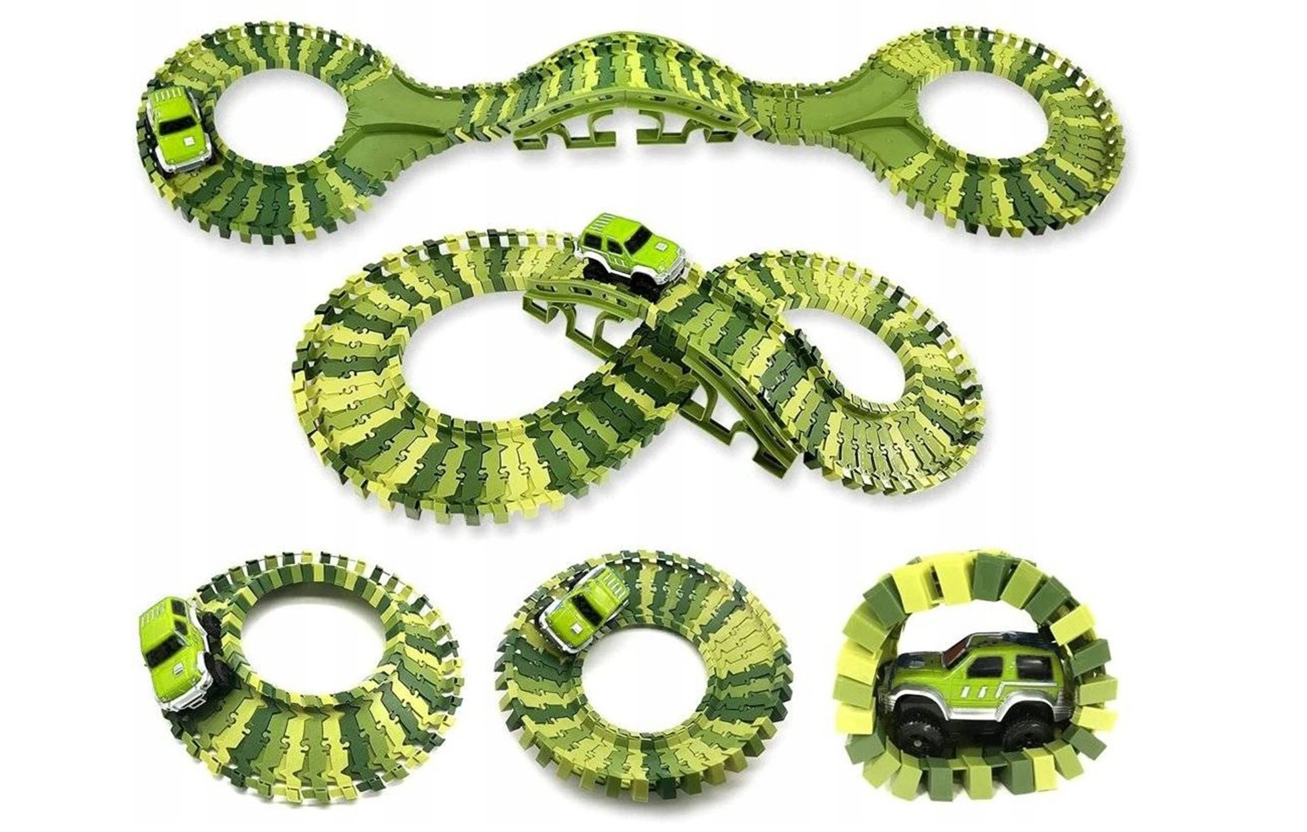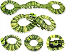 Максималните размери на сглобената писта са приблизително 80 × 85 × 8 см, така че без проблем се побира в детската стая. Комплектът развива творчеството, пространственото мислене и мануалните умения – и едновременно предлага динамично каране благодарение на еластичната повърхност на пистата с добра сцепляемост за превозното средство.