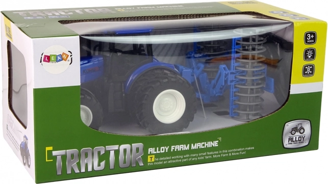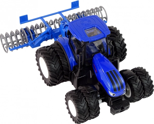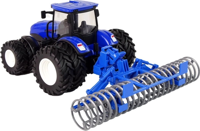 Открийте забавния RC трактор в мащаб 1:24 с син метален капак и сгъваема дискова брана отзад. Благодарение на удобното управление 2,4 GHz движението напред/назад и завиването е интуитивно, гумените гуми осигуряват добра тяга, а предните светлини осветяват пътя по време на движение. Страхотен избор за креативна фермерска игра и развитие на въображението при деца от 3 години.