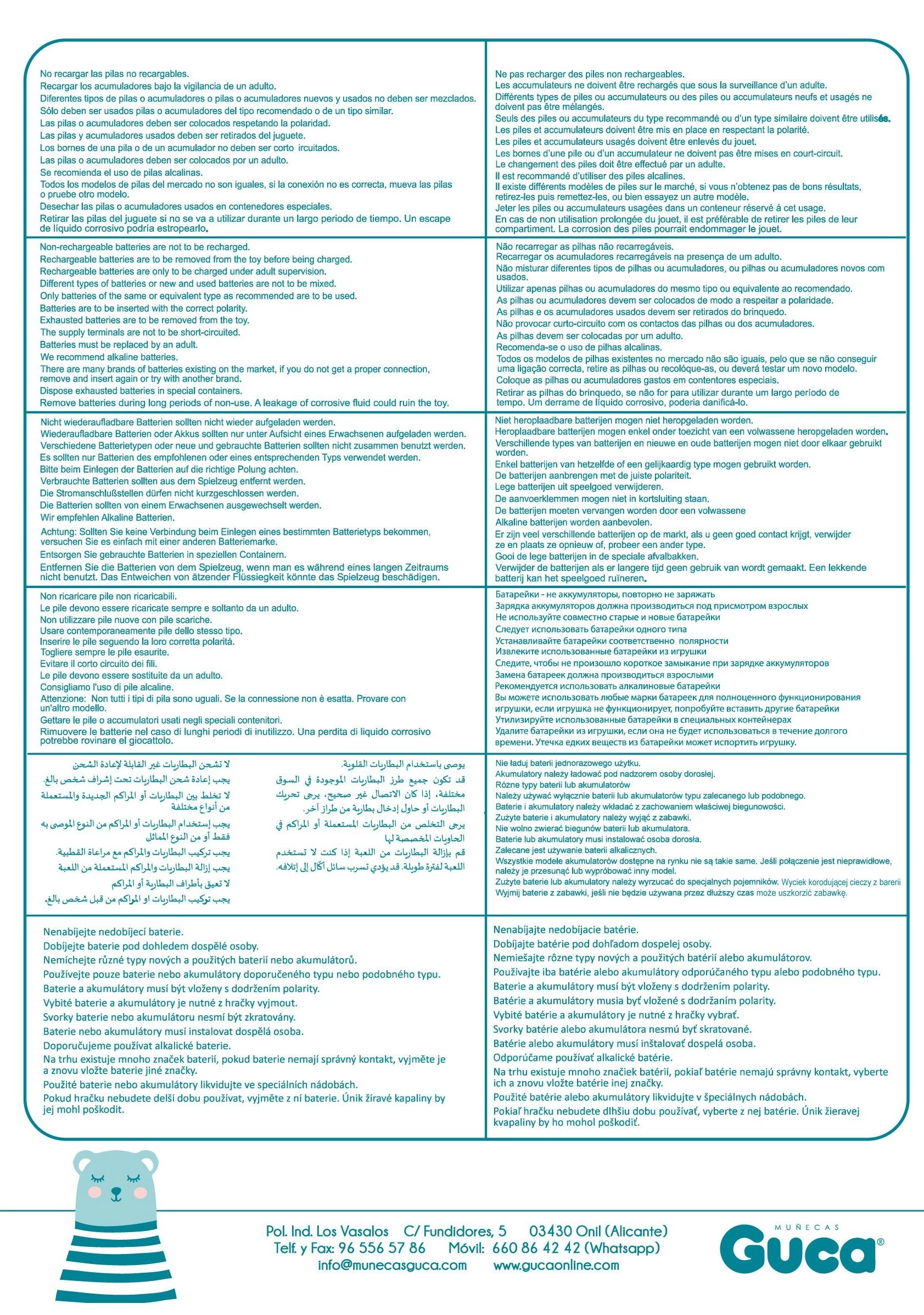 Куклата е ръчно изработена в Испания и пристига в подаръчна кутия, което я прави чудесен подарък. Препоръчва се за деца над 3 години. Комплектът съдържа три батерии тип копче LR44 и инструкции за тяхната подмяна.