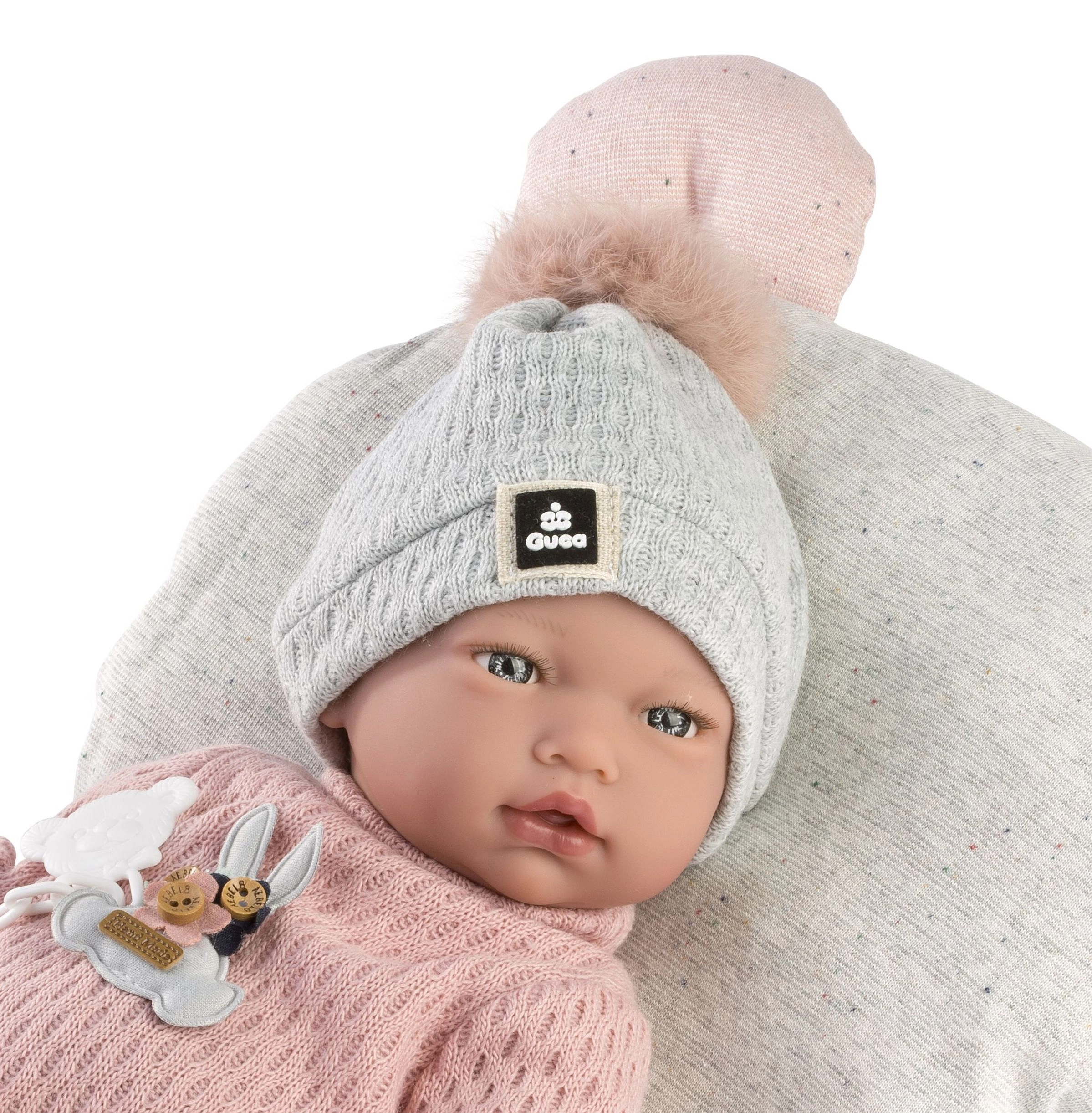 Куклата е ръчно изработена в Испания, което гарантира високо качество на изработката. В комплектa е включен биберон като аксесоар и батерии LR44 (3×) с инструкции за подмяна. Идеален подарък за деца от 3 години, опакована в елегантна подаръчна кутия.
