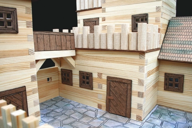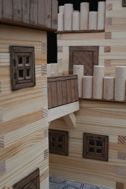 Дървени греди 9×9 mm и хартиени допълнения (прозорци, врати, покриви) осигуряват достоверен облик на средновековната архитектура.