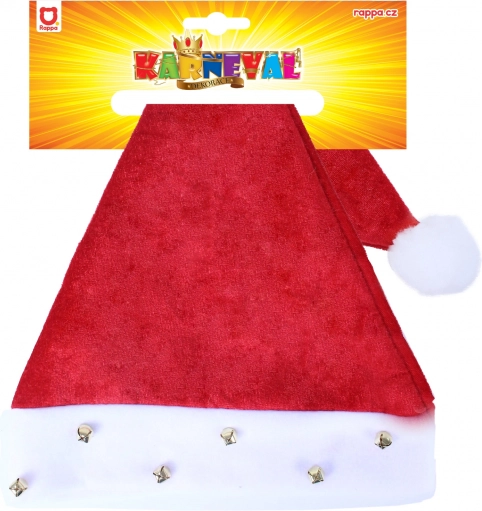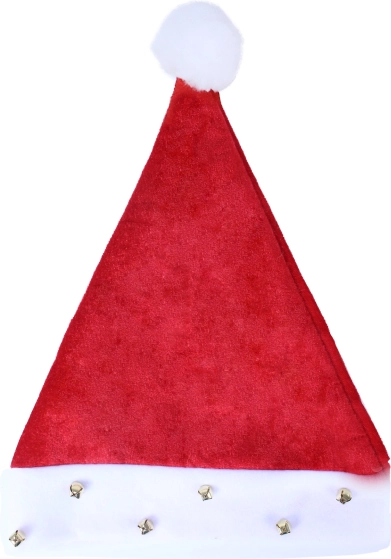 Стилна коледна шапка с бял кант, украсена със звънчета и помпон. Идеална за коледни партита.