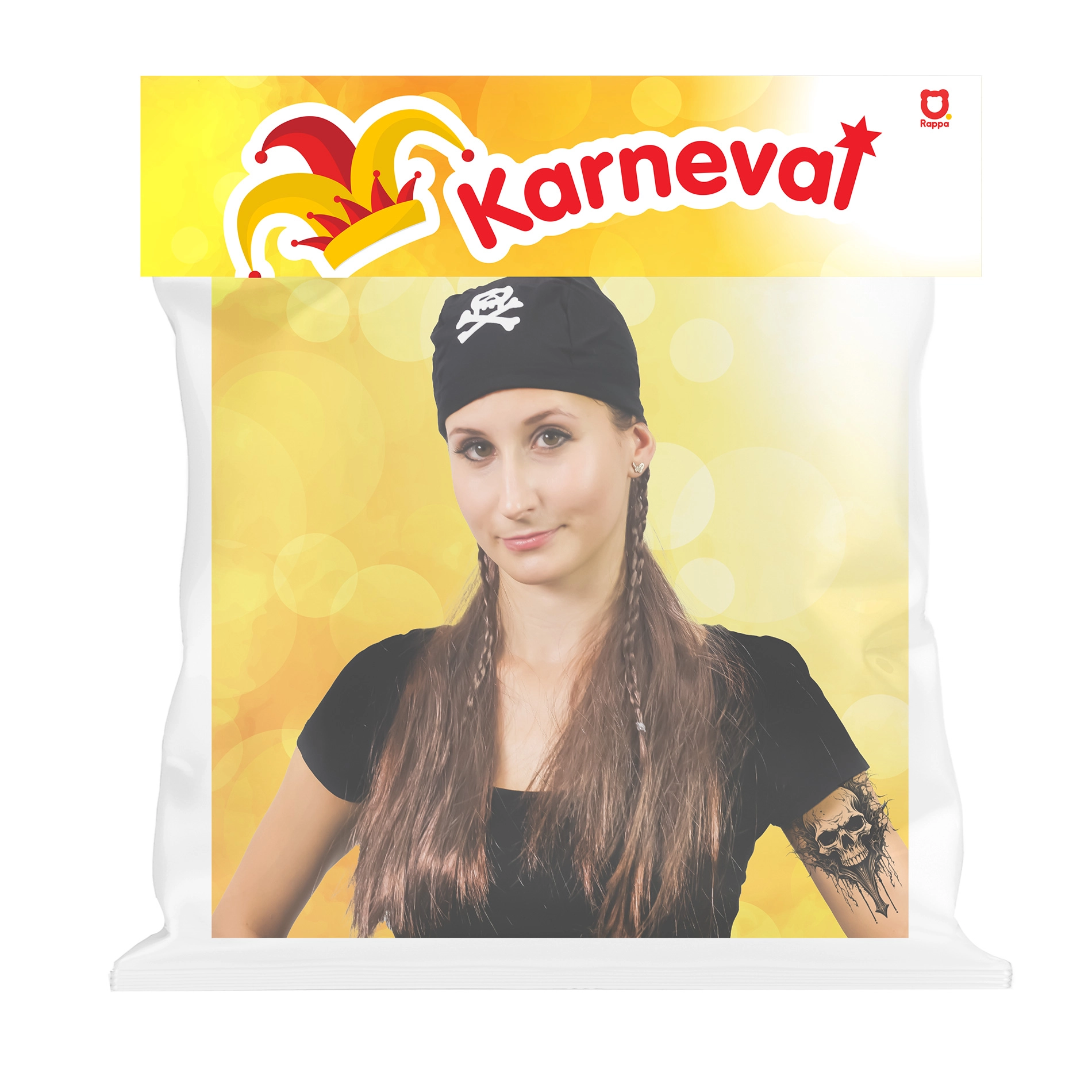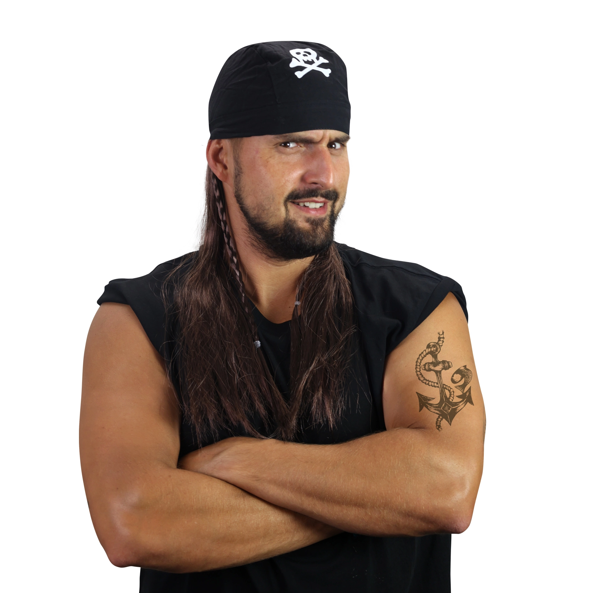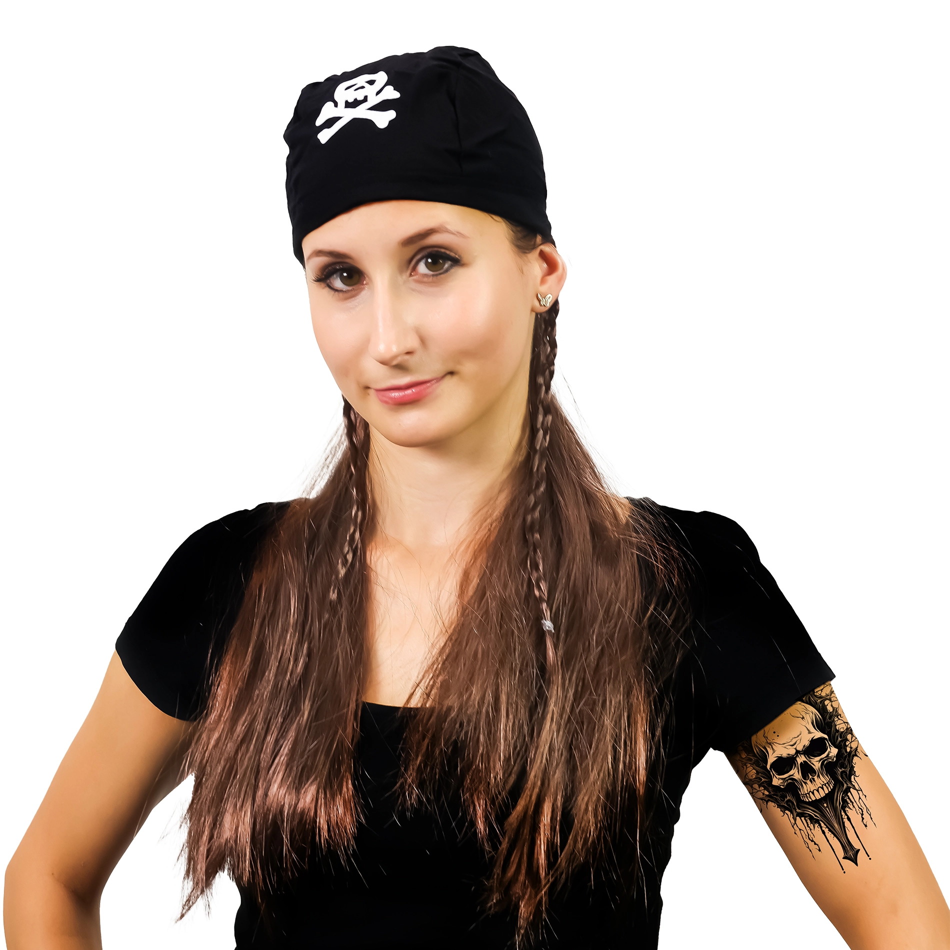 Влезте в ролята на безстрашен пират за секунди. Тази пиратска перука с кърпа се отличава с изразителен pirate look със символ на череп и кръстосани кости, който веднага привлича вниманието. Чудесна е за карнавал, Хелоуин, маскен бал и тематични събития.