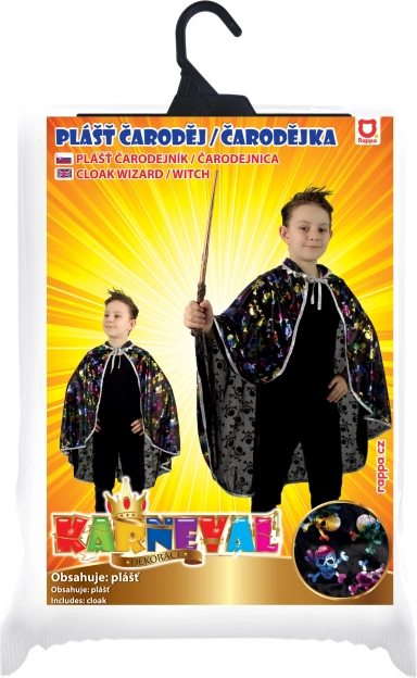Превърнете детето за миг в магьосник или вещица с лек и удобен плащ, който лесно се връзва на врата. Благодарение на яката и ефектния металически принт на черепи костюмът изглежда впечатляващо на всяка снимка и на дансинга.
