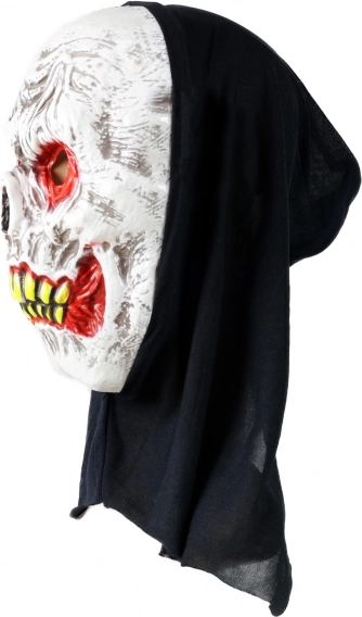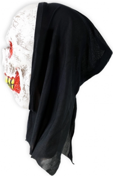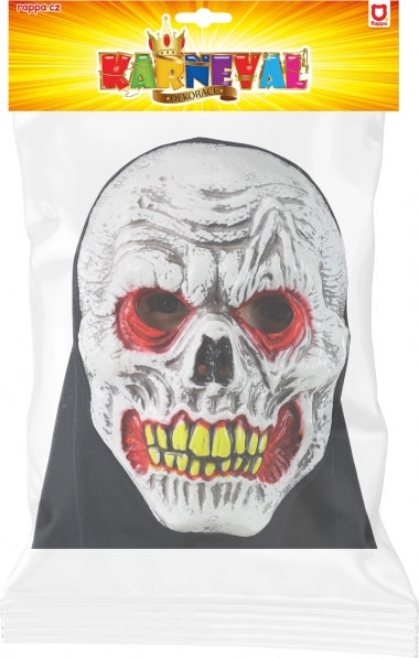 Тази маска на череп с черен шал/качулка ще преобрази костюма ви за миг. Контрастната бяла изработка с червени контури около очите и жълти зъби подчертава ужасяващия вид, който изпъква отлично на снимки и в тъмното под светлините на партито.