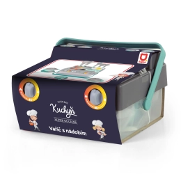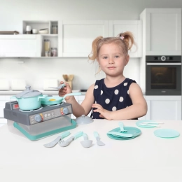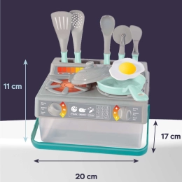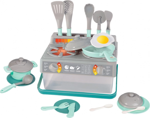 Този детски кухненски комплект в сиво и тюркоазено включва всичко необходимо за игра на готвачи. Част от комплекта са: