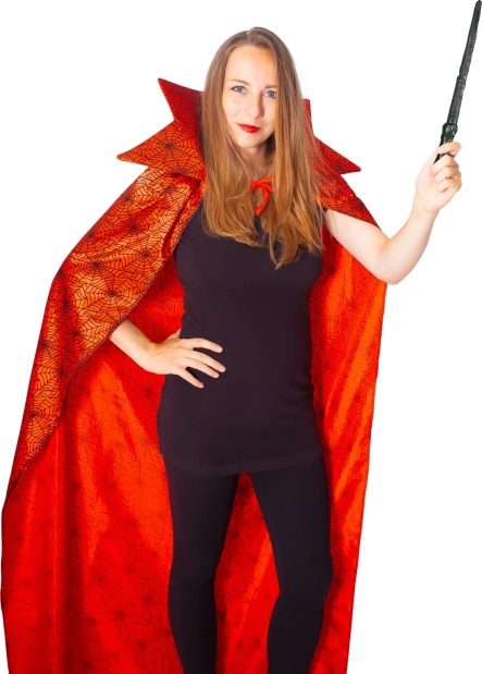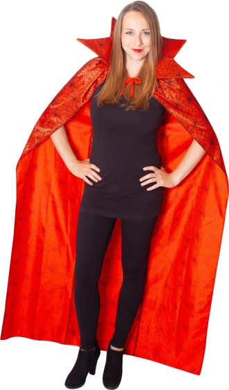 Превърнете се за миг в тайнствен образ – червената наметка с паяжинест мотив и висока яка е перфектен избор за Хелоуин, тематични партита, театрални представления и маскарадни балове. Блестящият ефект на материята и наситеният цвят привличат вниманието и подчертават вашия костюм.