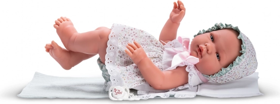 Куклата е красиво облечена в бяла дантелена рокличка с шапчица и идва с възглавничка, завивка и биберон на верижка, който може да се постави в устичката. Подходяща за ролеви игри, развива емпатия, фината моторика и въображението.