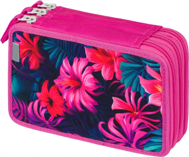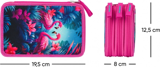 Този трипластов ученически несесер с тропически мотив фламинго и цветни листа предлага не само стил, но най-вече функционалност за организиране на всички ваши писмени принадлежности. Всяко отделение използва надеждни маркови ципове YKK, а подсиленият гръб улеснява манипулацията при затваряне.