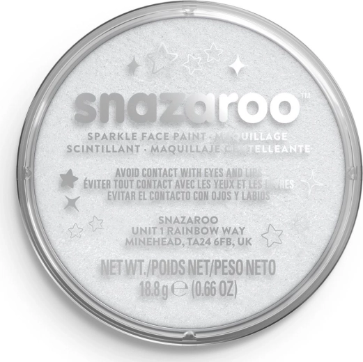 Професионална блестяща бяла боя за лице и тяло SNAZAROO в практична опаковка 18 ml. Предлага дълготрайни, ярки и наситени цветове, лесно нанасяне с четка или гъбичка и е безопасна и нетоксична, подходяща и за чувствителна кожа. Лесно се отмива с вода и сапун, идеална за празненства, карнавали, Хелоуин и Деня на детето.