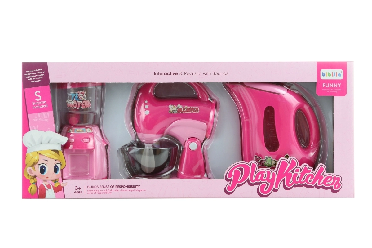 Интерактивен комплект детски кухненски уреди за малки готвачи, предлагащ реалистична игра с миксер, кана и бъркалка. Звуци и светлинни ефекти стимулират детските сетива и чувство за отговорност от 3-годишна възраст.
