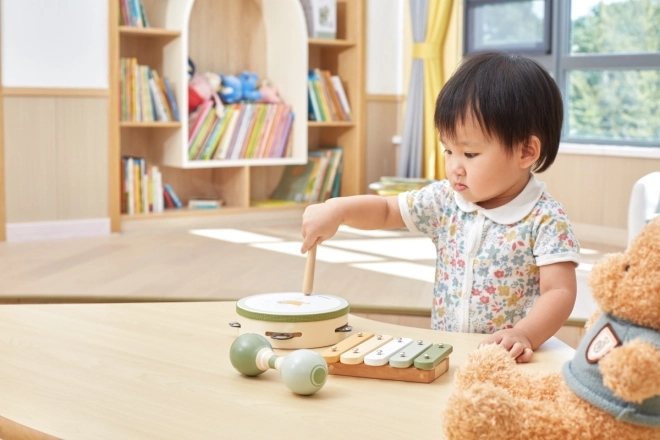 Комплектът включва тамбура, ксилофон и маракаси, които позволяват на децата да експериментират с различни звуци и ритми.