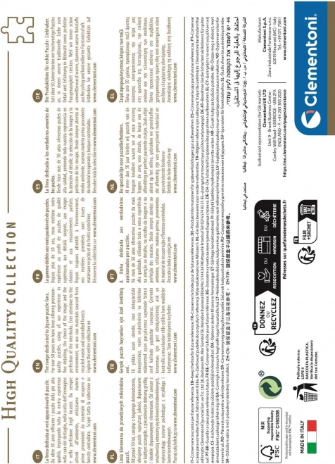Открийте елегантния мотив на Париж – Айфеловата кула, градски икони и стилна цветова палитра превръщат този пъзел в чудесен избор за любителите на градски пейзажи. Марката CLEMENTONI е известна с прецизния печат, здравата изработка и точно пасващите части.