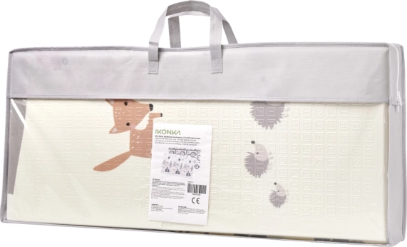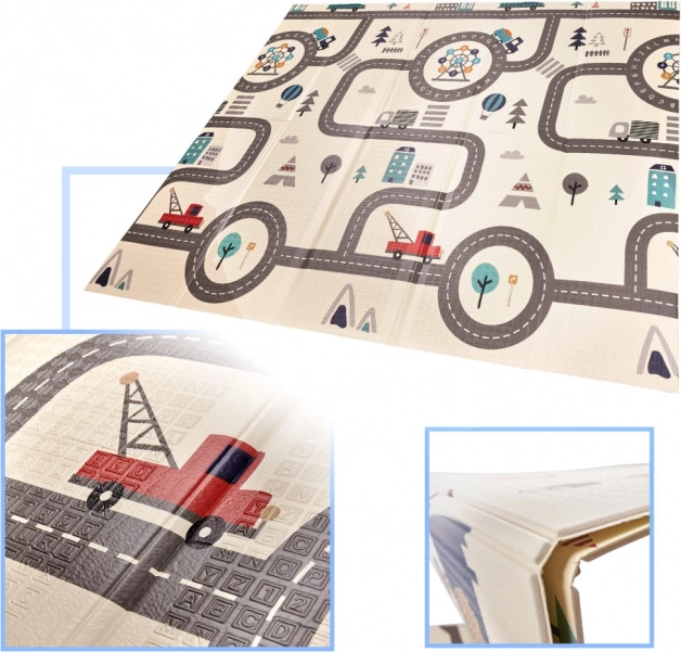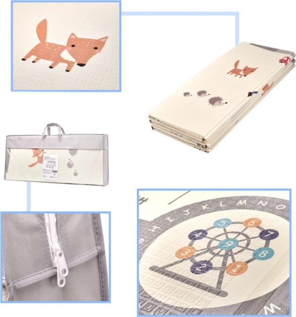Дизайнът на постелката насърчава въображението и ученето: от едната страна сладки животни и природа, а от другата улици и кръстовища за часове забавление с колички. Постелката се сгъва бързо и се пренася лесно в включената чанта с дръжка, не заема място и поддръжката отнема секунди – достатъчно е да я забършете с влажна кърпа.
