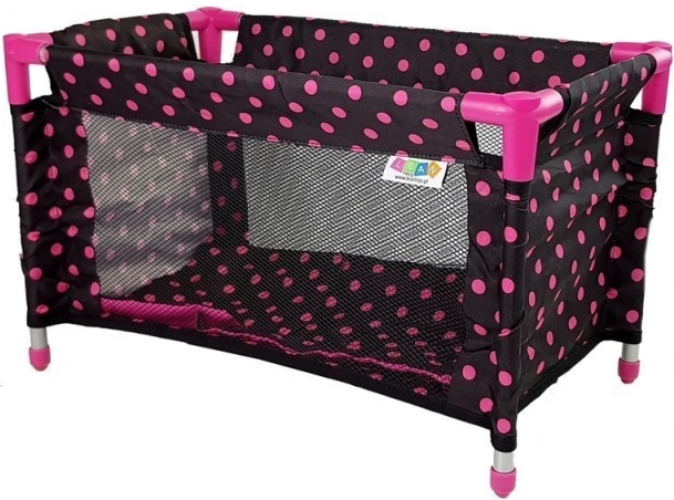 Стилно легло за кукли Alice в черно-розов дизайн на точки ще зарадва всяка малка майка. Има прозрачни мрежести страни за лесен надзор над куклата, здрава алуминиева конструкция с розови пластмасови сглобки и се доставя с възглавничка, завивка и практична чантичка за пренасяне. Подходящо за кукли до 40 cm.