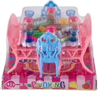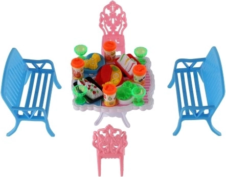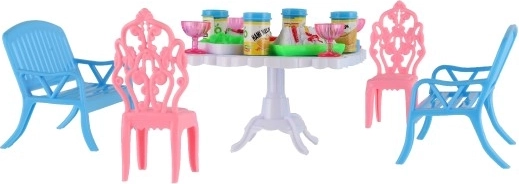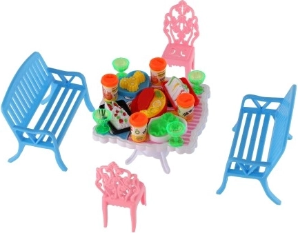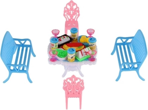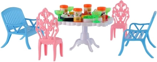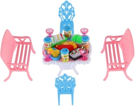 Сетът съдържа 2 пейки, 2 столчета и маса, допълнени с 13 броя аксесоари – чашки, кенчета, чинии и поднос. Всичко необходимо за пиршеството на вашите кукли.