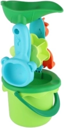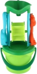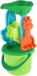 Този цветен комплект за пясък съдържа всичко, което малките строители се нуждаят за своите първи зидове, тунели и формички. Кофата със сито помага за пресяване на пясъка, лопатката и гребличките улесняват оформянето и наслояването, докато мелничката превръща сипването на пясък или наливането на вода в забавно зрелище.