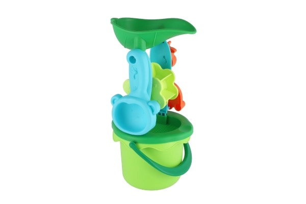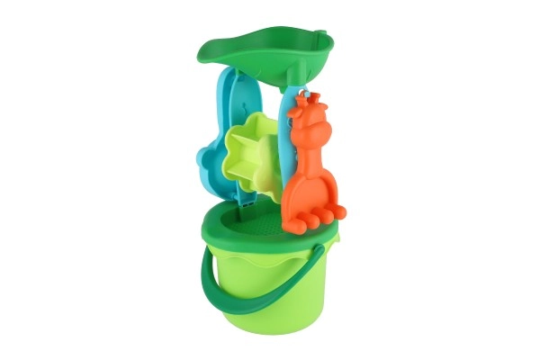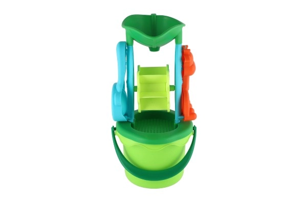 Практичният комплект комбинира кофа със сито, лопатка и греблички – идеално оборудване за строене на замъци и пресяване на пясък.