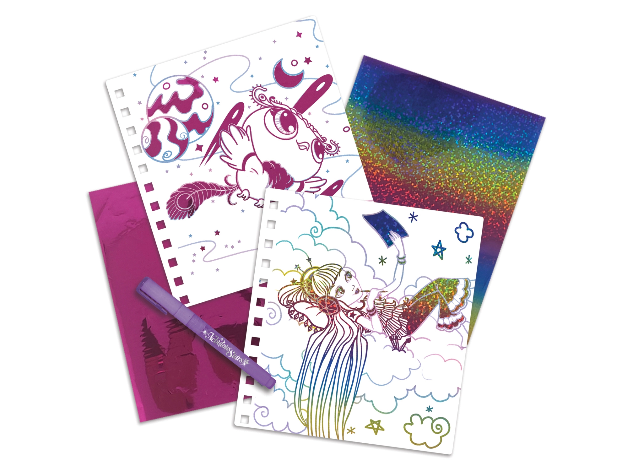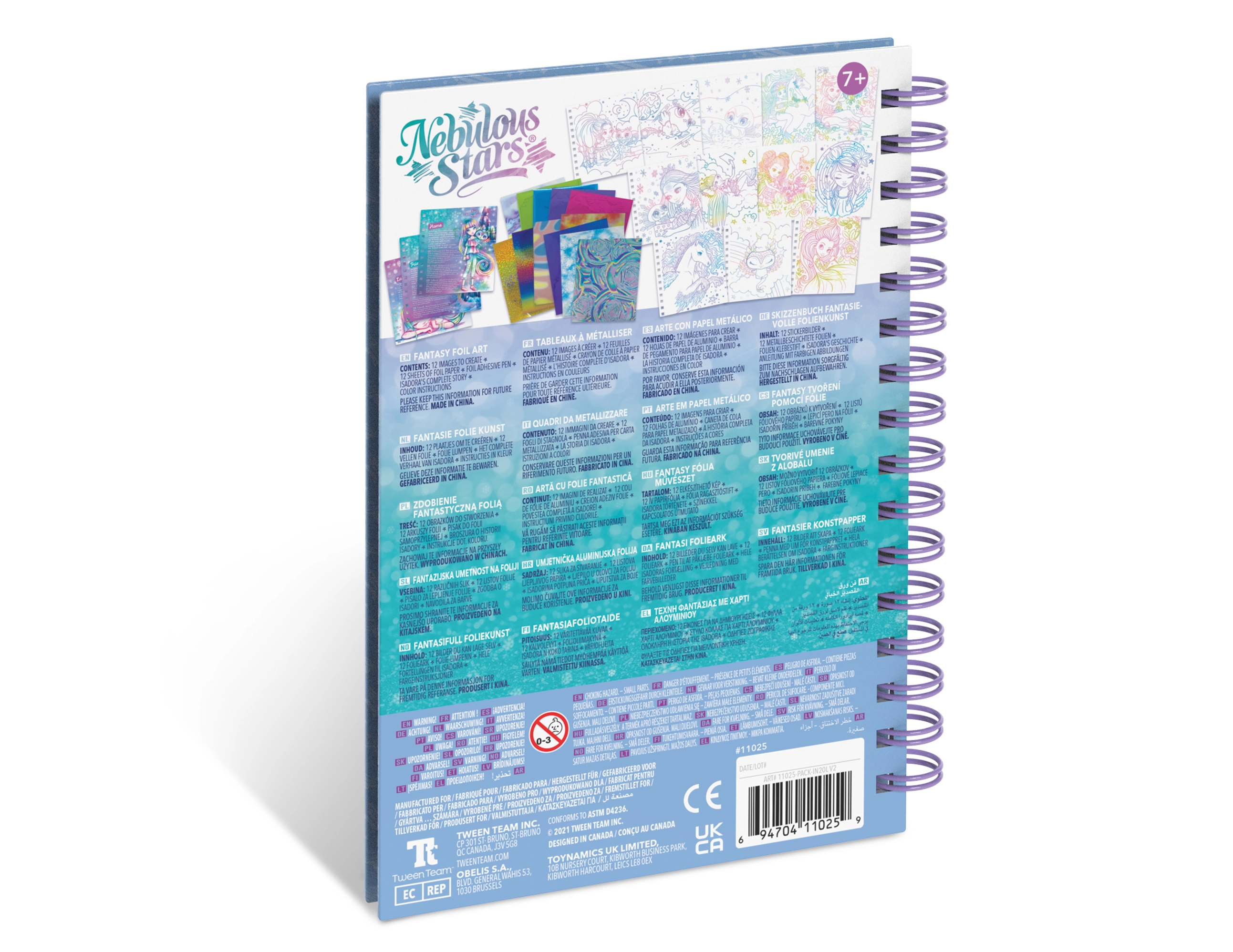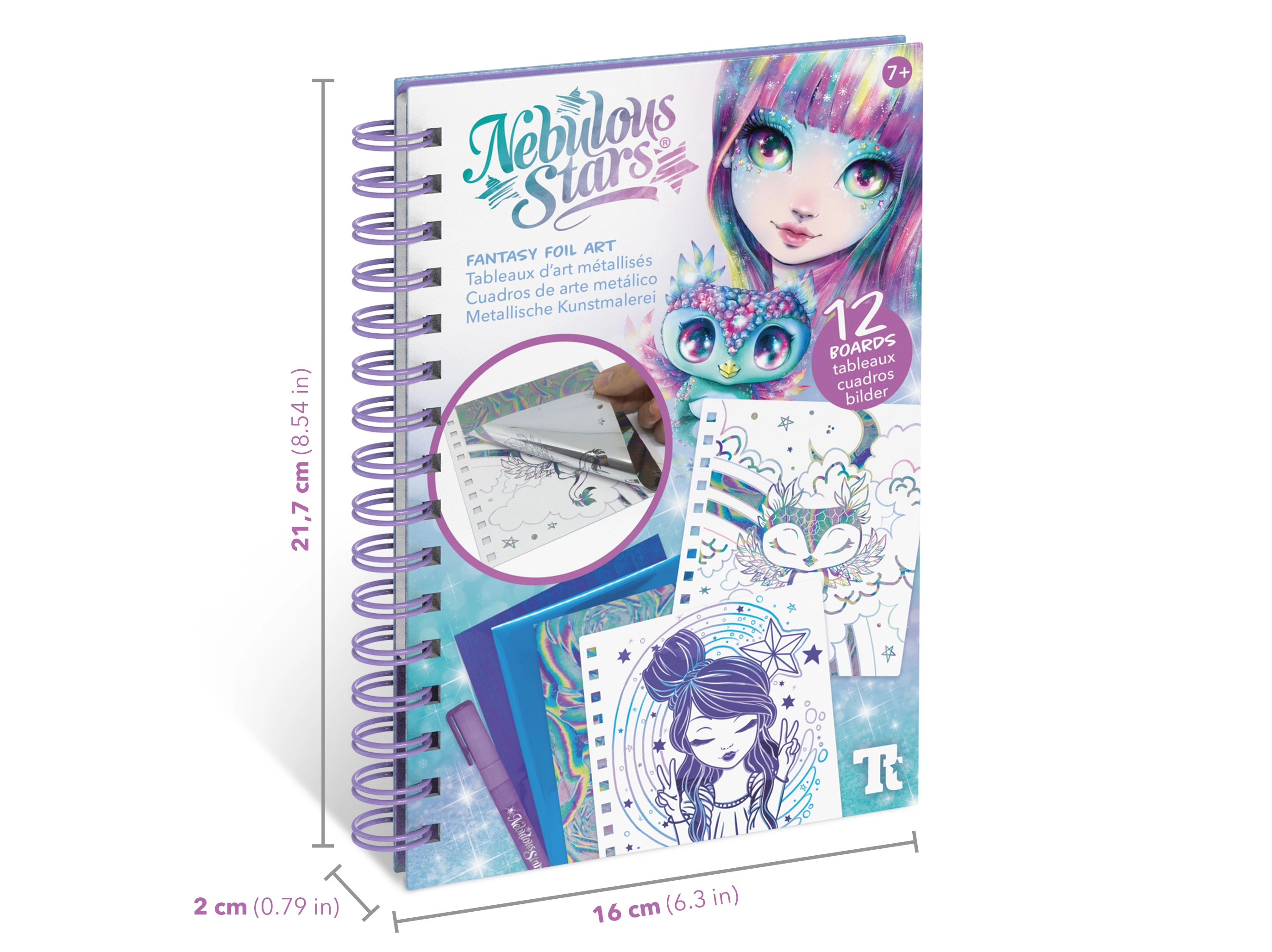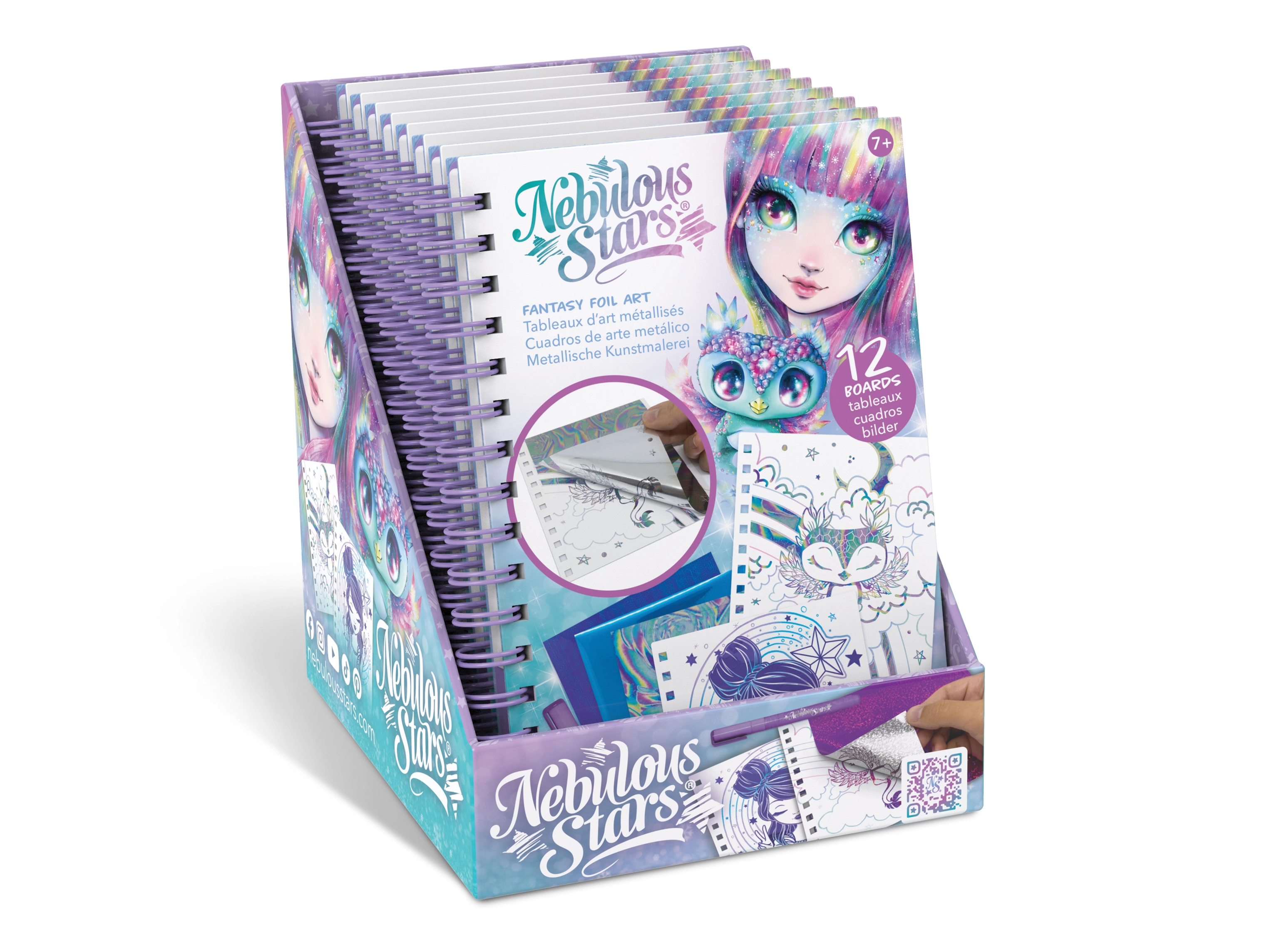 Този оригинален творчески комплект съчетава вълшебния свят на NEBULOUS STARS с лесната техника за декориране с метализирани фолия. Достатъчно е да нанесете лепило с перото, да поставите фолиото и леко да го отлепите – получава се ярък, блестящ ефект, който превръща всяка картинка в малко художествено произведение.