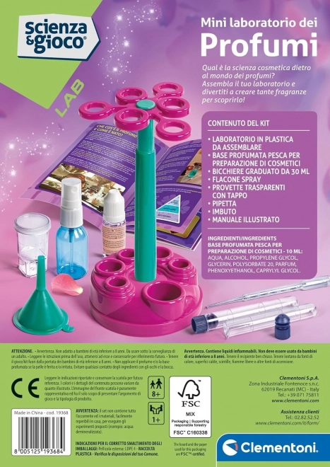 С тази малка парфюмна лаборатория лесно ще създадете у дома оригинални аромати, ще упражните основи на химията и изследване на сетивата. Комплектът е проектиран да бъде забавен, образователен и безопасен за деца и възрастни. В основата на експериментите е нежна прасковена миризма, която можете да комбинирате и да пробвате различни интензитети.