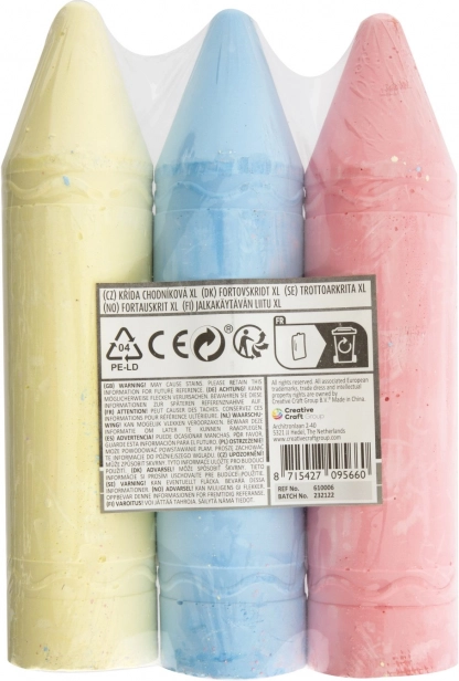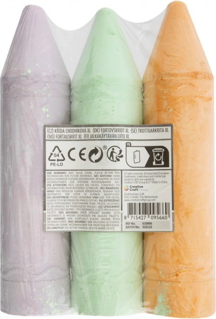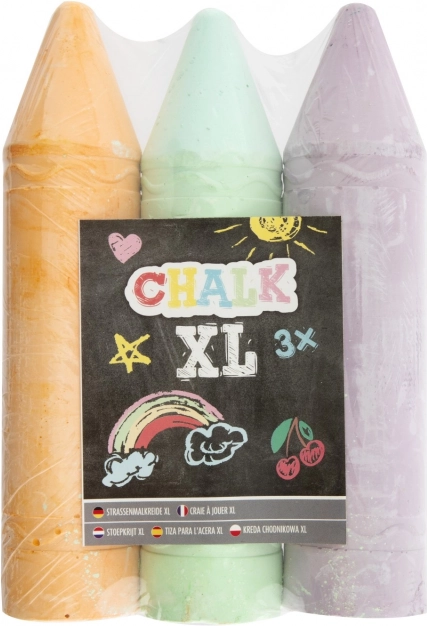 Обогатете своите рисувателни занимания с тези цветни тебешири XL, които се предлагат в два варианта – жълт, син и розов или оранжев, зелен и лилав. Всеки комплект съдържа три тебешира с оптимална дължина 19 см, което улеснява захвата при рисуване.