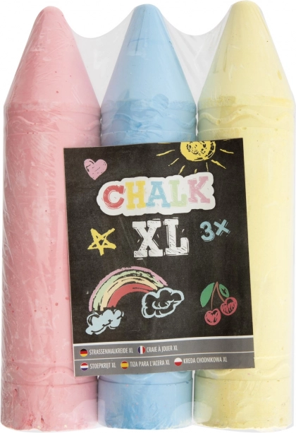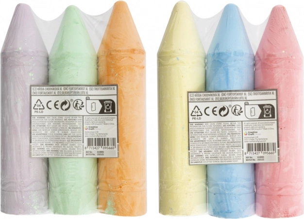 Комплект от цветни тебешири XL с дължина 19 см в два цветови варианта. Идеални за креативно рисуване върху различни повърхности.