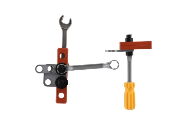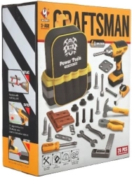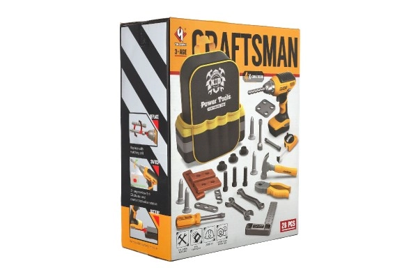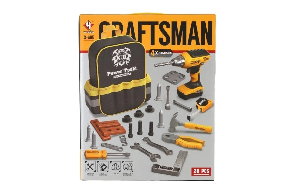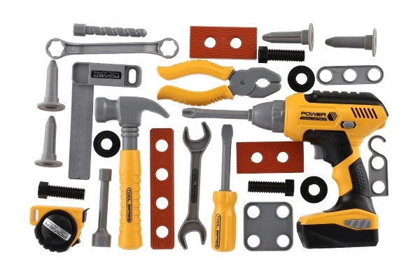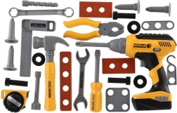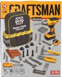 Комплектът съдържа 28 части, включително акумулаторна бормашина, която имитира истински работни инструменти за забавна и образователна игра.