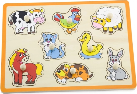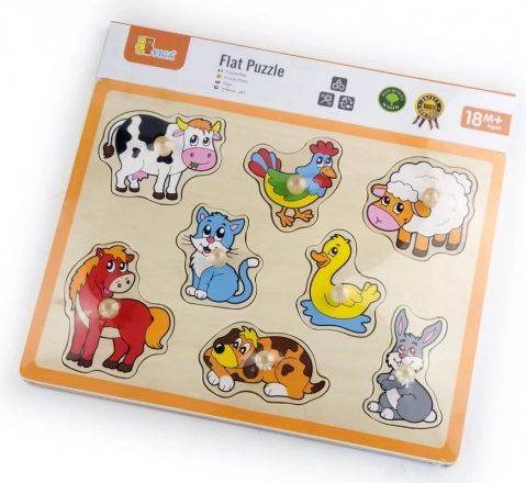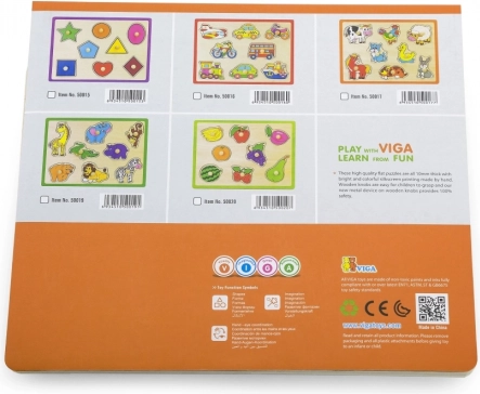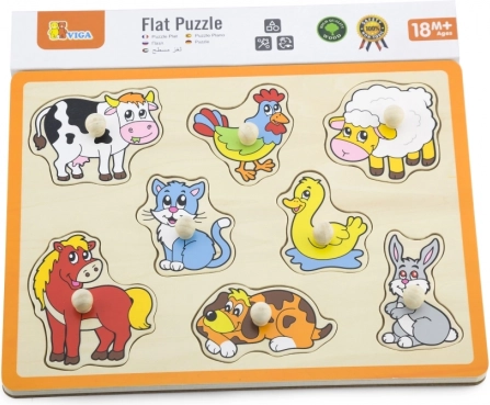 Дървеният пъзел от компанията Viga е проектиран да стимулира въображението и моторните умения на децата. Състои се от дъска и 8 тематични елемента с копчета за лесно захващане. Елементите изобразяват животни и трябва да бъдат поставени в съответните отвори на дъската.