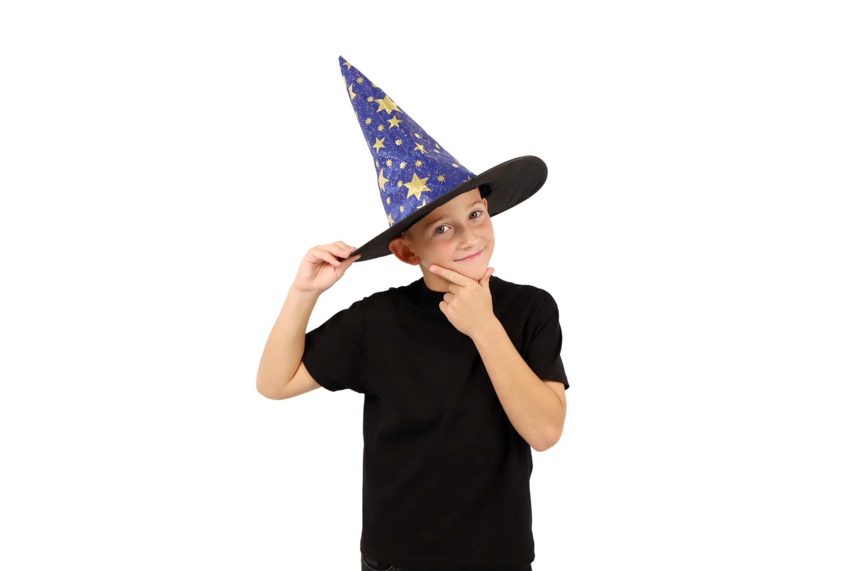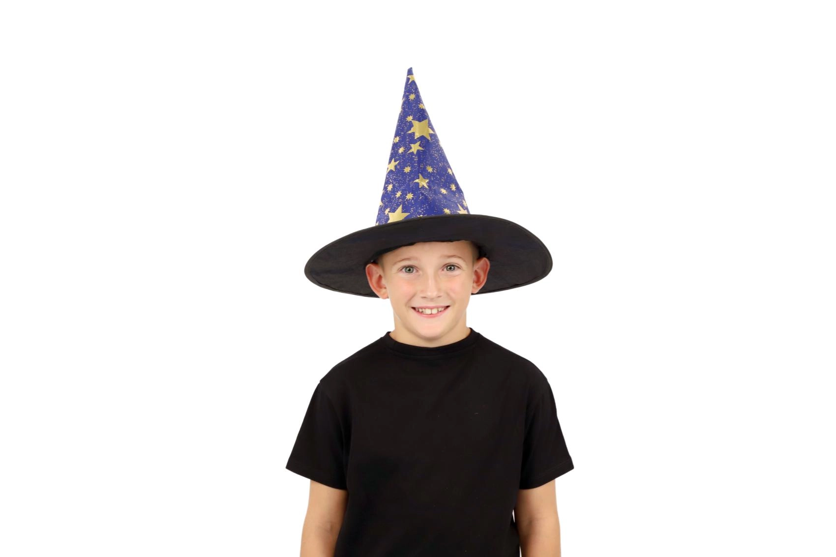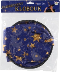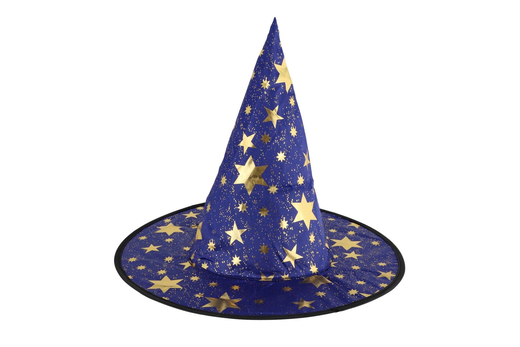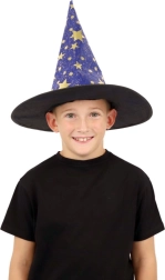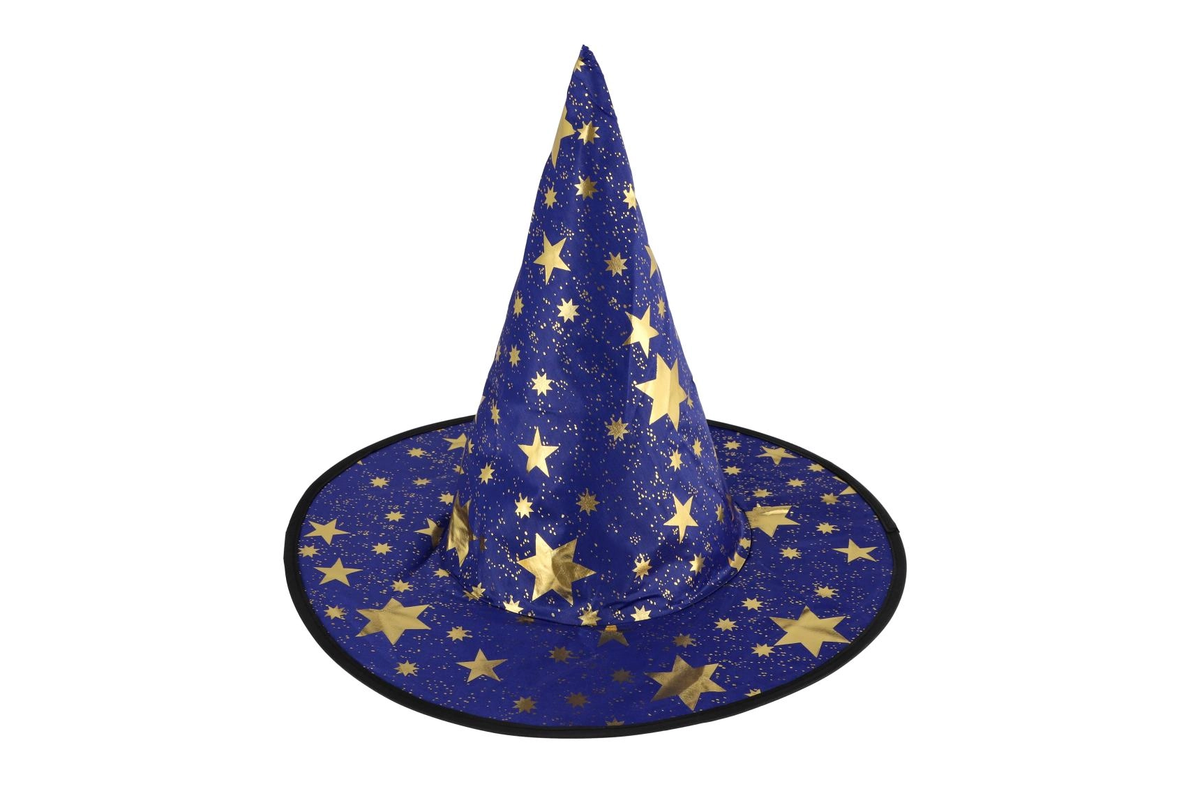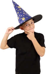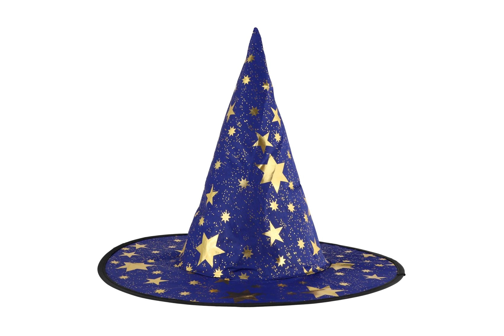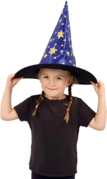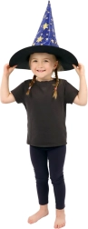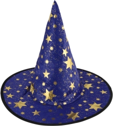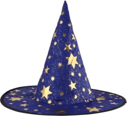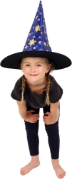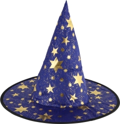 Създайте вълшебна атмосфера у дома с тази детска вещерска шапка в синьо–златно изпълнение. Лекият материал, широката периферия и високата заострена форма с блестящи звезди гарантират впечатляваща визия за карнавал, Хелоуин и тематични тържества.