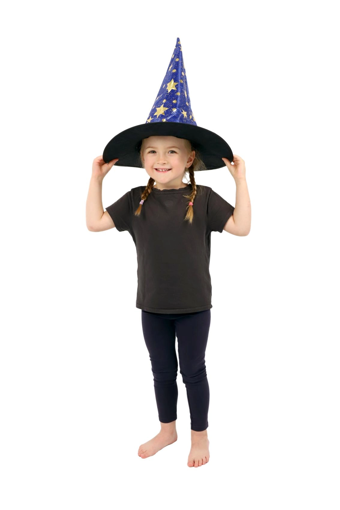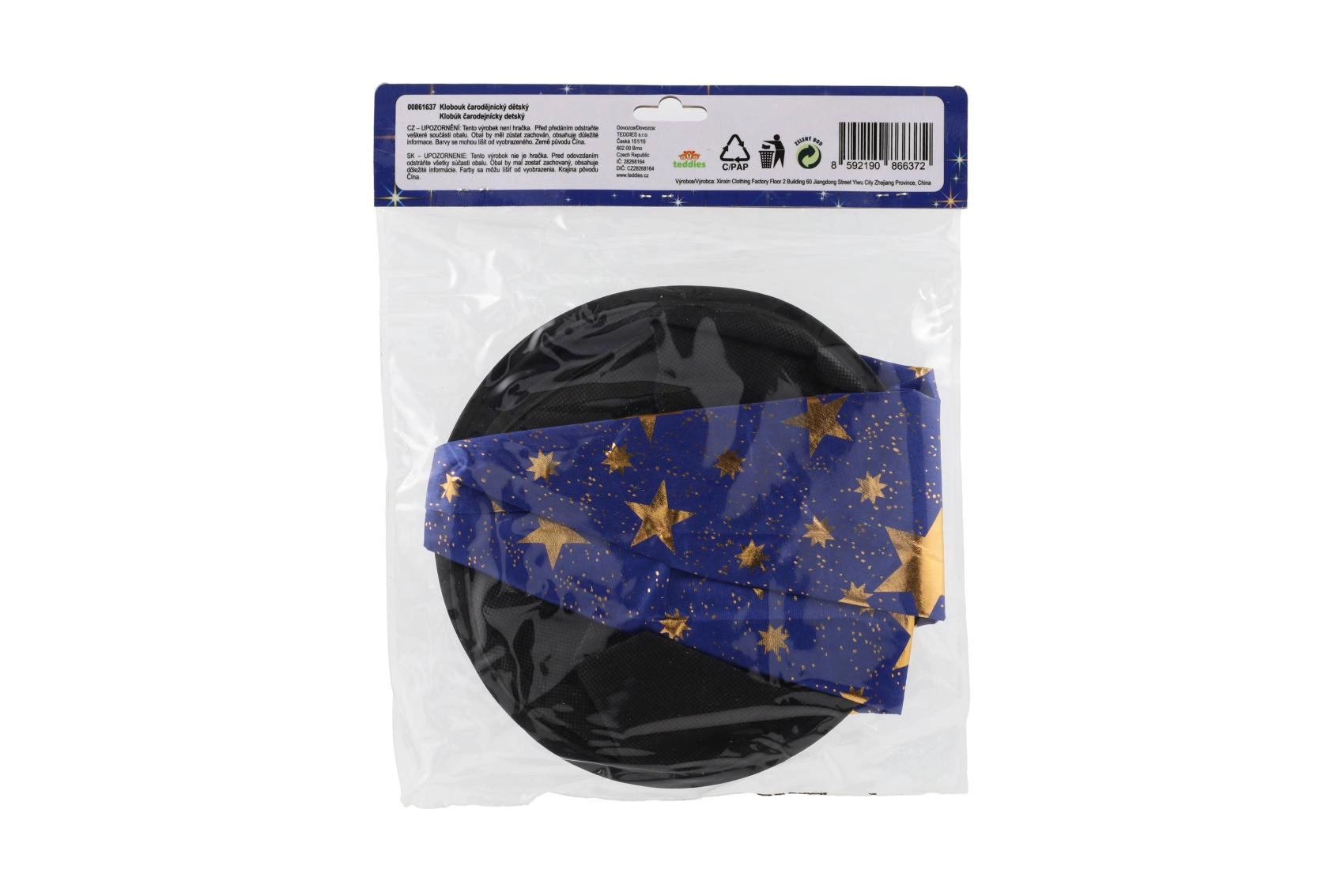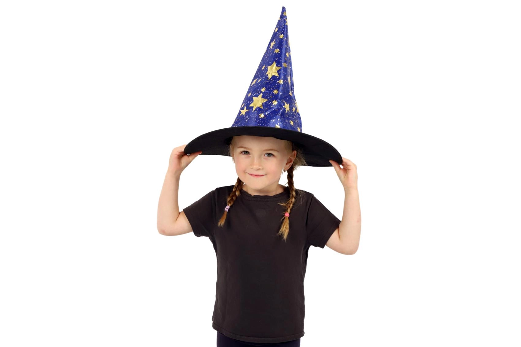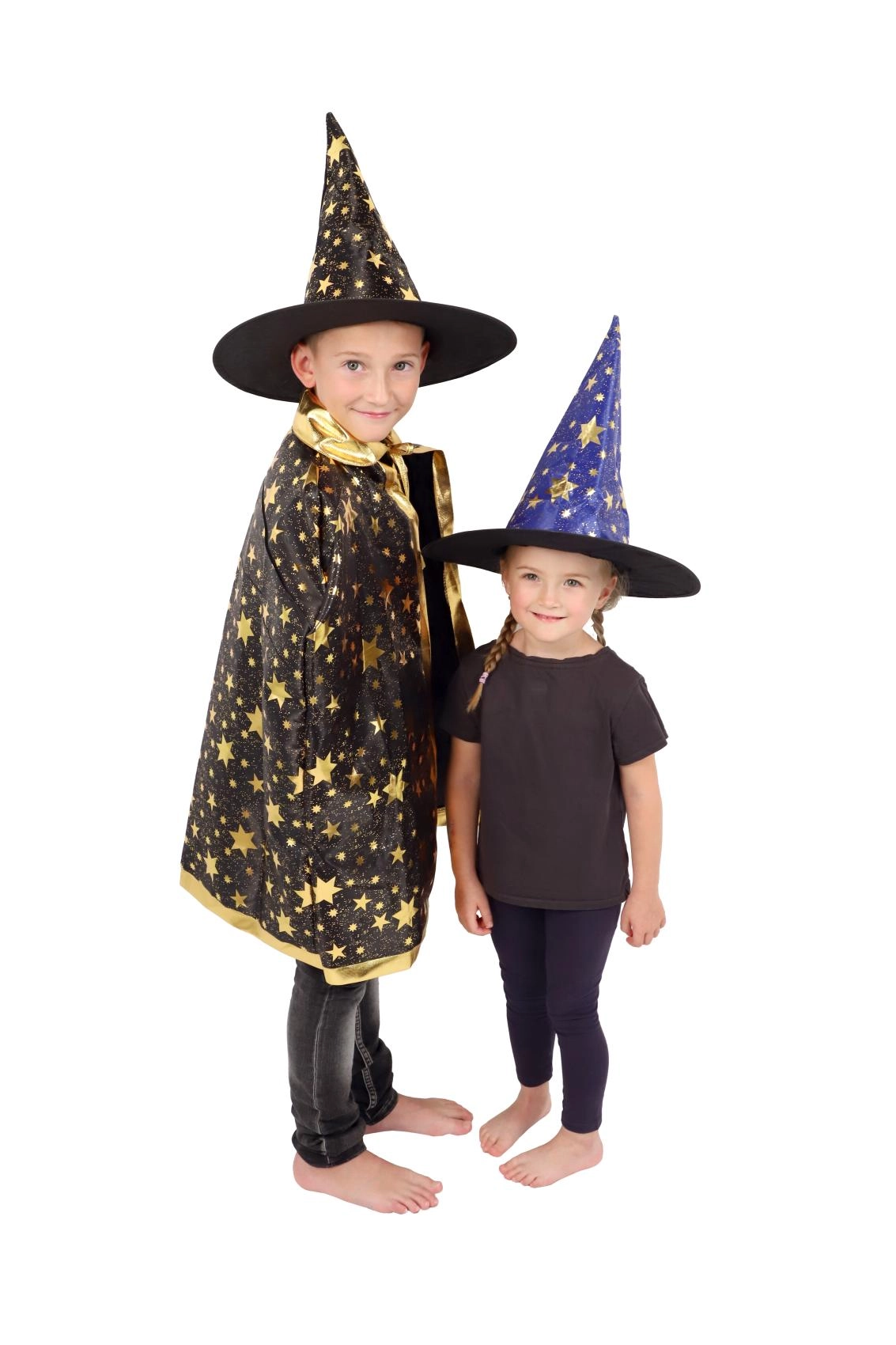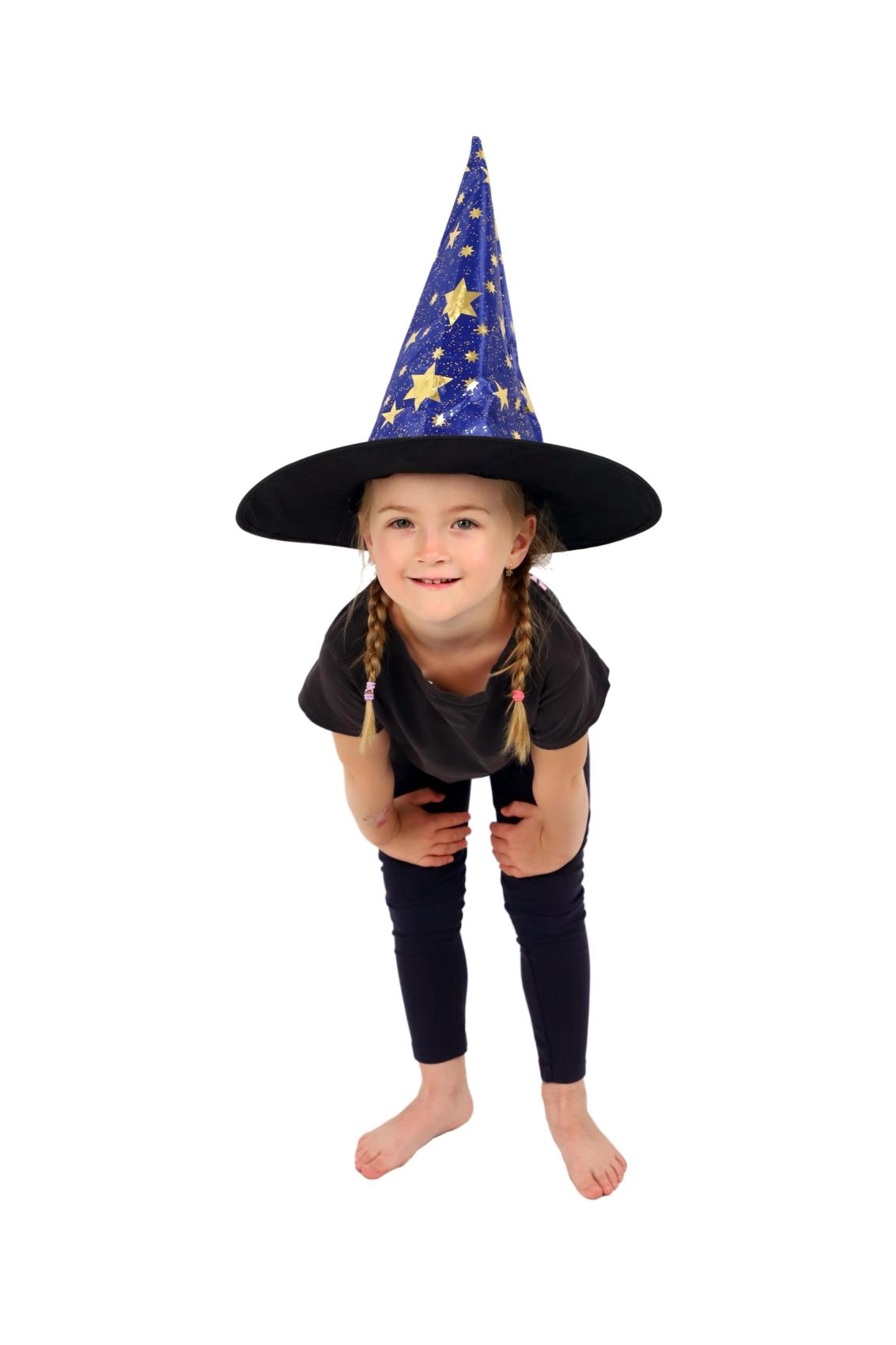 Създайте вълшебна атмосфера у дома с тази детска вещерска шапка в синьо–златно изпълнение. Лекият материал, широката периферия и високата заострена форма с блестящи звезди гарантират впечатляваща визия за карнавал, Хелоуин и тематични тържества.