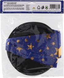 Тази синьо–златна вещерска шапка със звезден принт ще превърне всяко дете в малък маг. Благодарение на леката текстилна материя се носи приятно, запазва форма и е чудесно допълнение към костюм за карнавал, маскарад или театрално представление.