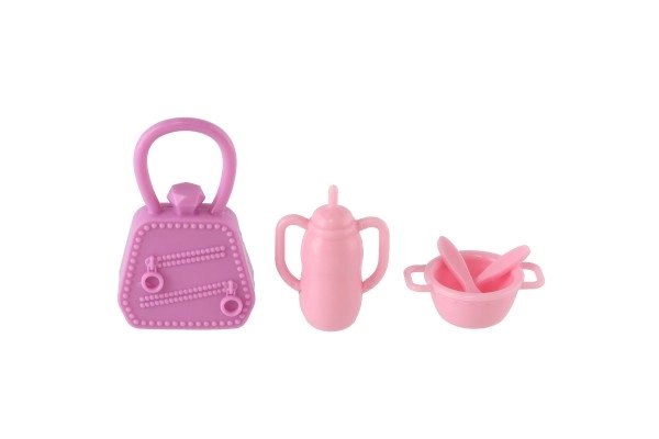 Куклата е облечена в елегантна рокля и може да излиза на разходки с всички важни аксесоари, които са част от комплекта. Всичко е изработено с внимание към безопасността и качеството, което гарантира дълготрайно забавление.