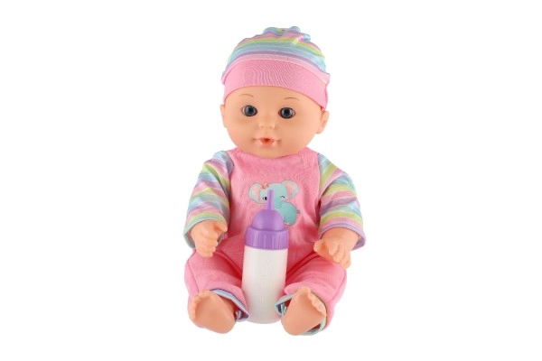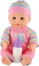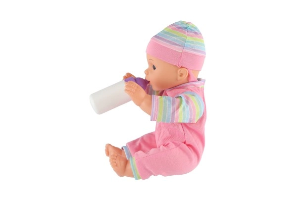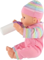 Част от комплекта е шишенце, с което децата могат да изпробват храненето на бебето и да развиват грижовни умения.