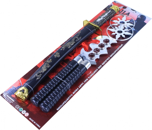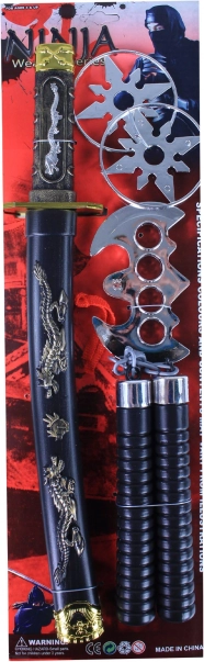 С този нинджа комплект играчки всеки малък боец може да се потопи в света на бойните изкуства. Комплектът включва меч катана с кания, украсена с детайлни орнаменти, както и други играчки като хвърлящи звезди и нунчаки за съвършена игра на боец.