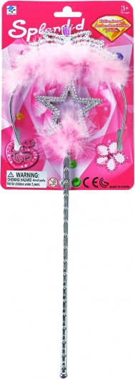 Ексклузивен комплект за принцеси! Този стилен сет включва ослепителна корона с цветни камъчета и жезъл, декориран с декоративни розови пера. Допълни своя костюм с тези великолепни аксесоари.