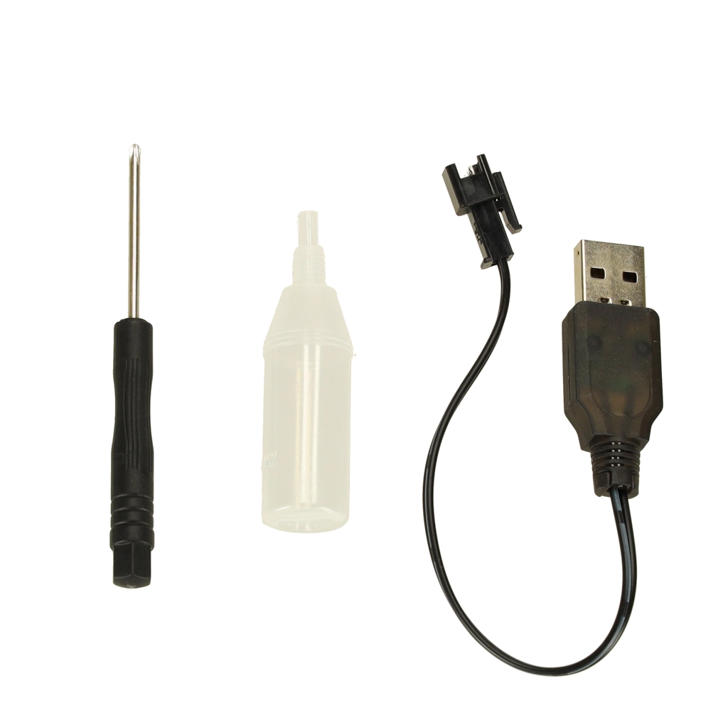 В комплекта ще намерите USB кабел за удобно зареждане на акумулатора, отвертка и контейнерче за вода за парния ефект. Контролерите се захранват от стандартни AA/AAA батерии (не са включени).