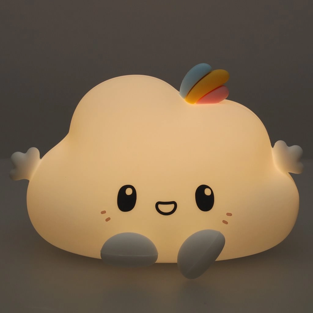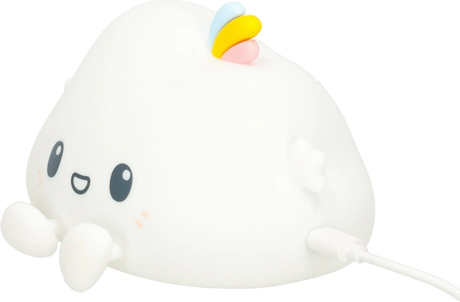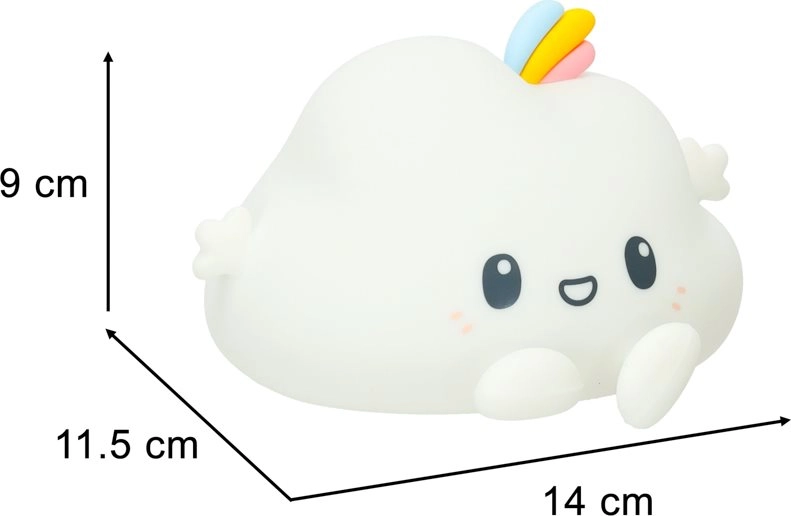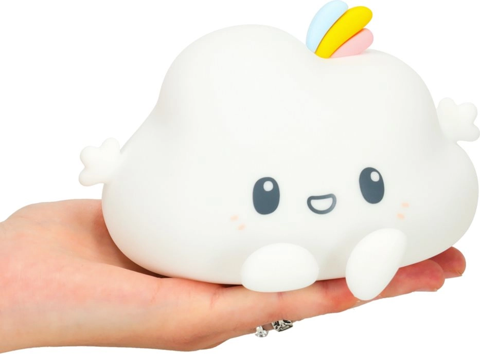 Тази детска нощна лампа във вид на усмихнато облаче внася спокойствие и уют в детската стая. Мекият силикон е приятен на допир и безопасен за децата, а нежната светлина помага да се преодолее страхът от тъмното и подпомага спокойно заспиване.