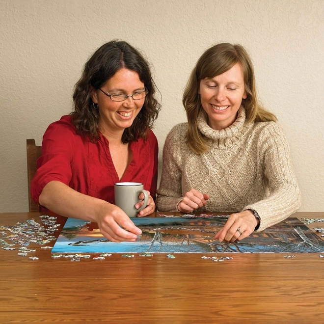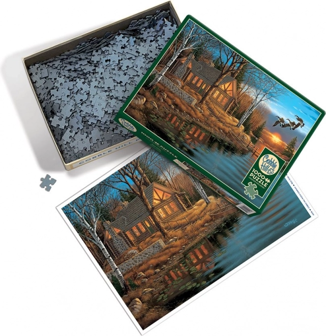 Атмосферичният мотив на спокойна хижа край езеро със залязващо слънце ще зарадва всеки любител на природата и релакса. Пъзелът с 1000 части от COBBLE HILL впечатлява с неправилната форма на елементите, които не следват стандартна мрежа – подреждането е по-забавно и едновременно с това малко по-предизвикателно.