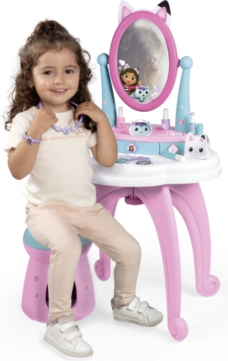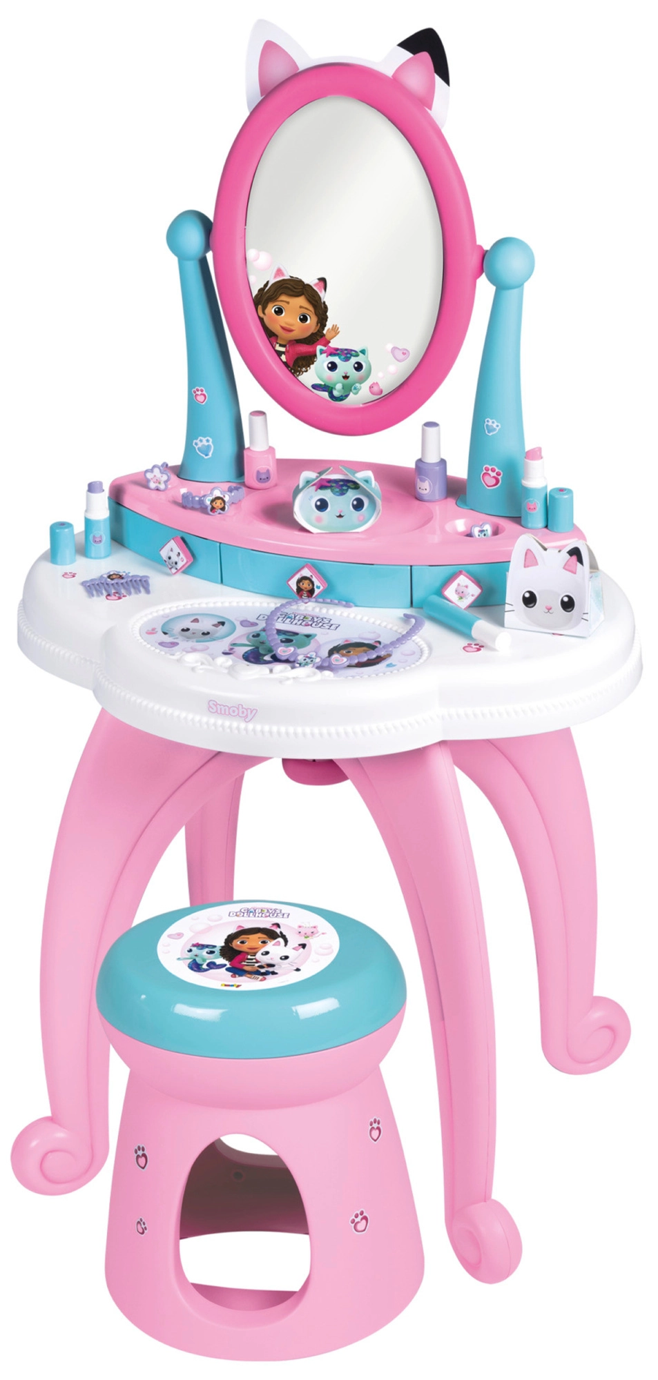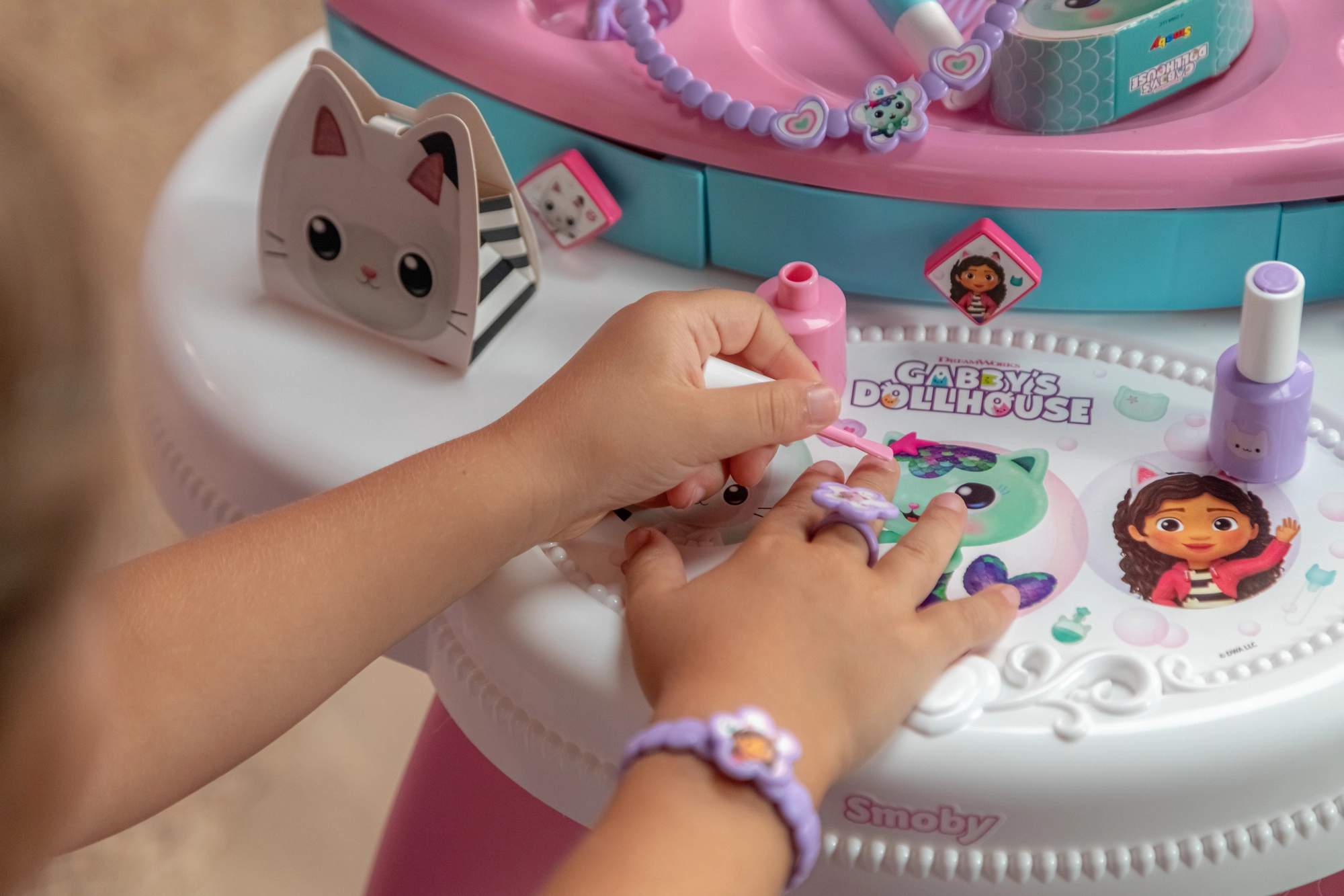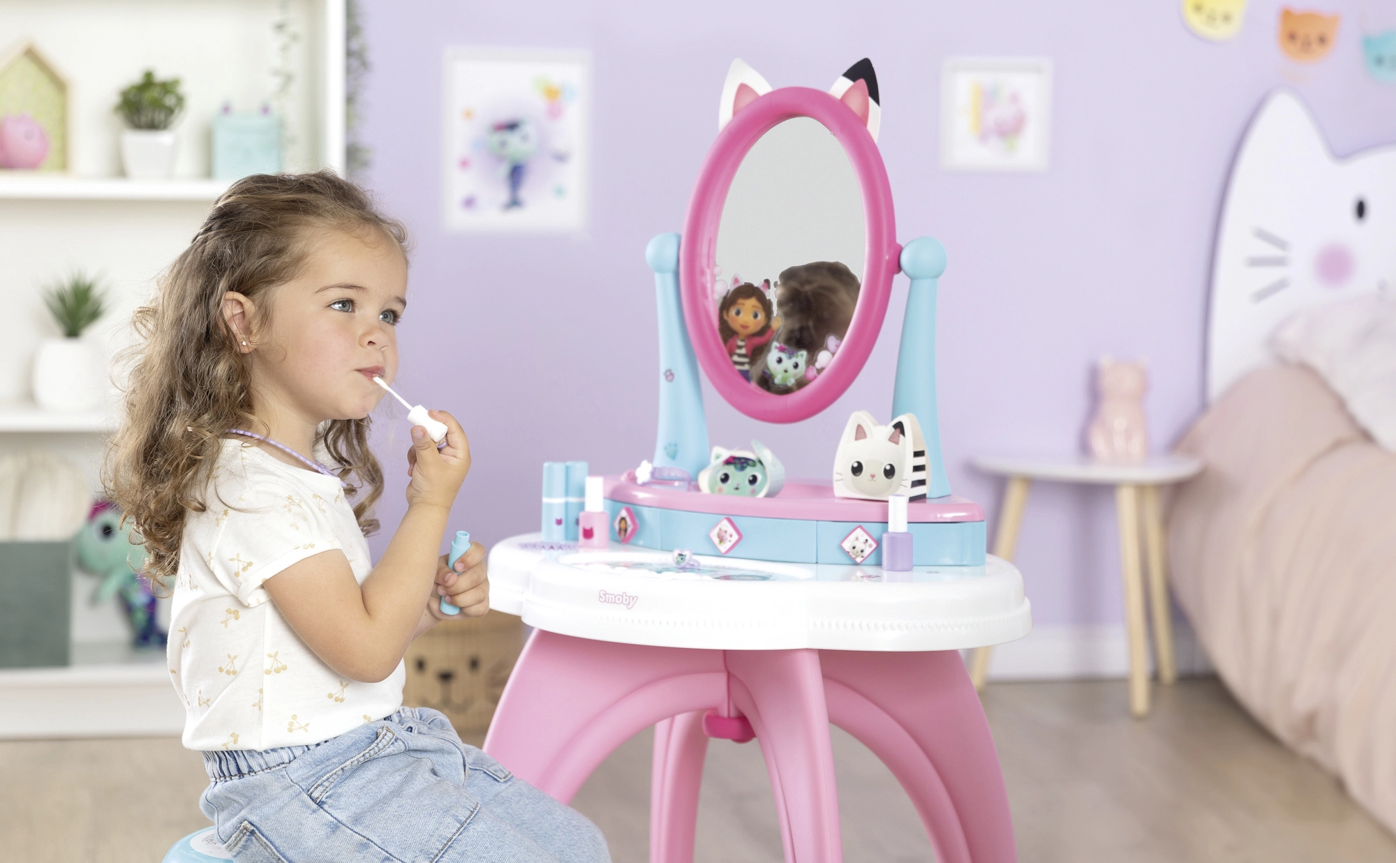 Детската тоалетка, вдъхновена от любимия сериал GABBY’S DOLLHOUSE, превръща стаята в малко козметично студио. Благодарение на голямото регулируемо огледало, трите чекмеджета и богатия комплект аксесоари, всичко е под ръка и играта е реалистична и безопасна.