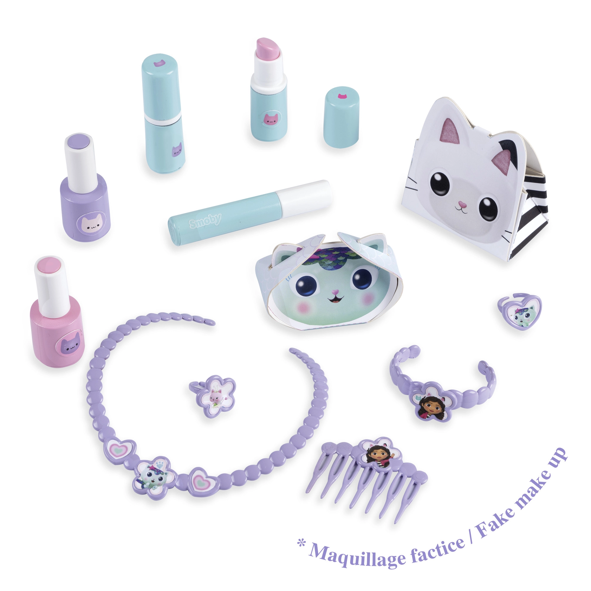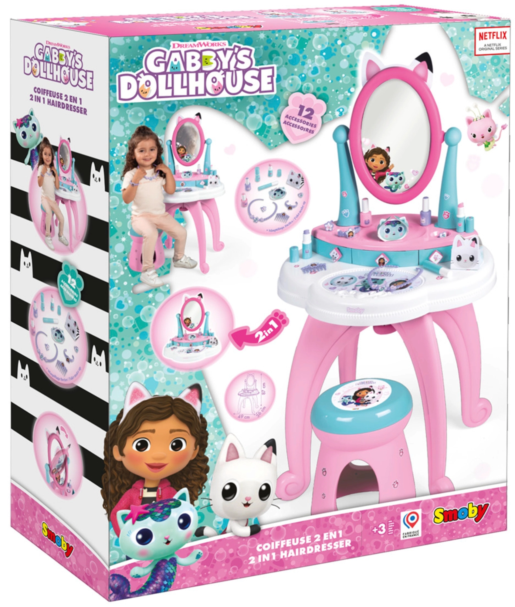 Влезте в магическия свят на GABBY’S DOLLHOUSE с детската тоалетка 3 в 1 от Smoby. Предлага сушене със сешоар, гримиране и грижа за ноктите, има голямо регулируемо огледало, 3 чекмеджета и удобно столче. В комплекта има 12 аксесоара за креативна игра и развитие на въображението.