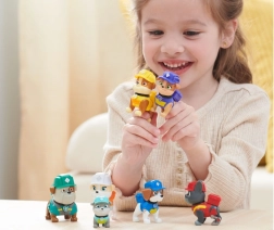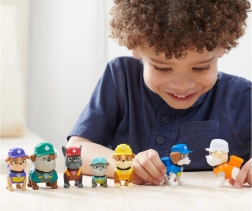 Открийте най-бързия начин да съберете цялата строителна бригада от PAW Patrol: Ръбъл и неговата бригада. В комплекта ще намерите Ръбъл, Уийлър, Микс, Чарджър, Мотор, леля Кранова и дядо Чакълс. Всяка фигурка е около 5 см, стои самостоятелно и впечатлява с ярки цветове, каски, ранички и детайли, верни на екрана.