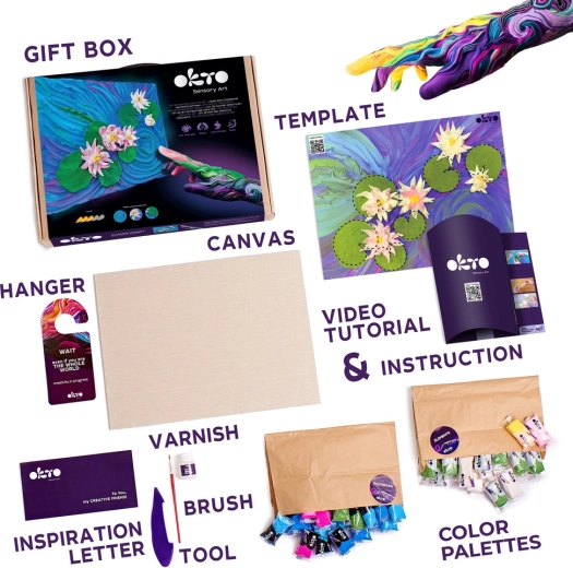Открийте радостта от създаването с творческия комплект Okto „Водни лилии“ във формат 30 × 40 cm. В опаковката ще намерите всичко необходимо за собствено художествено произведение: естествено платно, моделиращи маси, акрилен лак на водна основа, четка, дървен инструмент за моделиране и ясен наръчник с инструкции.